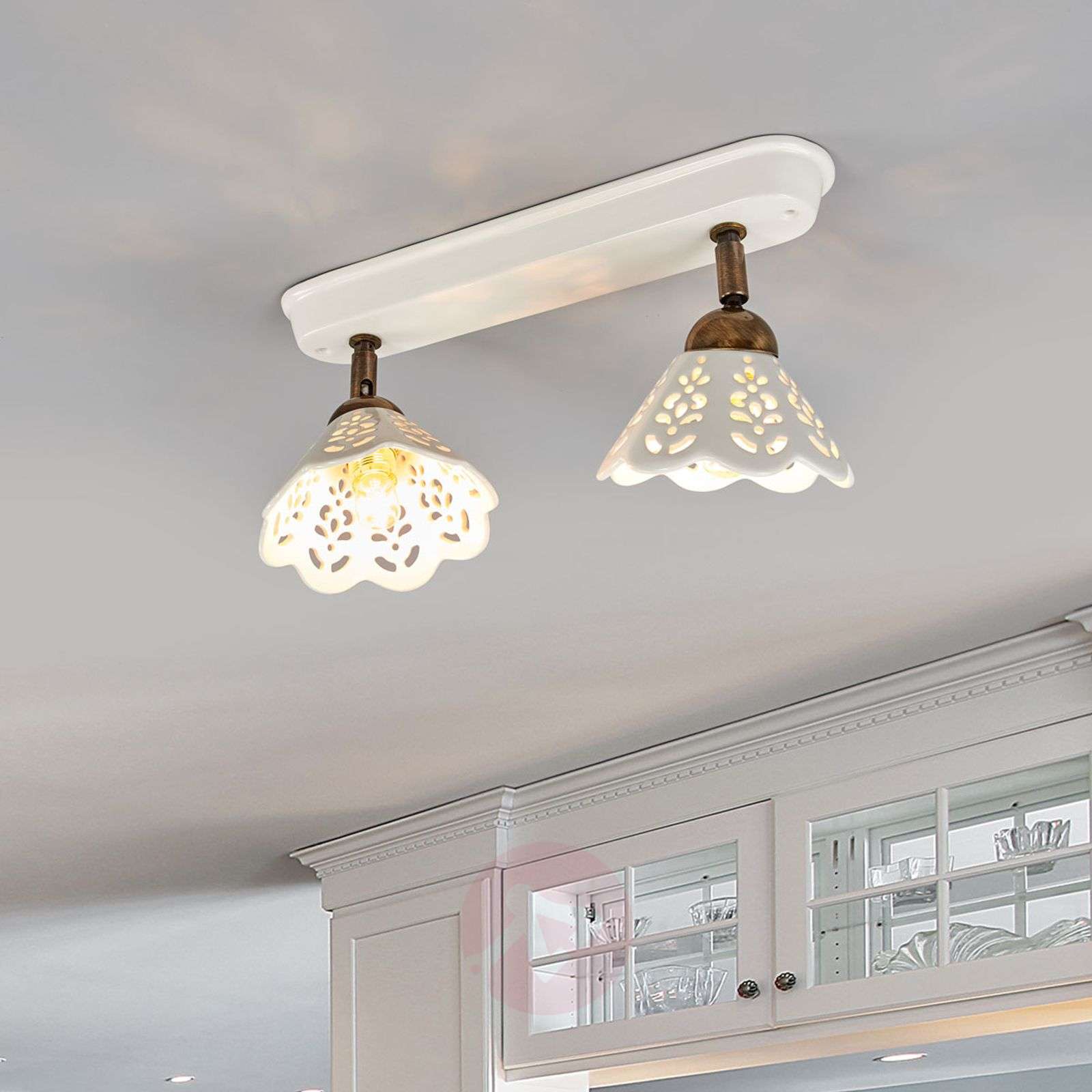 Urocza lampa ścienna i sufitowa PORTICO z metalową oprawą Ta urocza lampa o nazwie PORTICO będzie pięknym akcentem w romantycznym dworku. Ma ceramiczne, glazurowane na biało klosze ozdobione kwiatowym wzorkiem z otworami; ich krawędzie są lekko zaokrąglone. Całość przywodzi na myśl koronkę i roztacza aurę naturalności. Padające w dół światło lampy odbija się tworząc refleksy. Metalowe zwieńczenia kloszy i biała, ceramiczna szyna harmonizują w kolorystyce i stylu z charakterem lampy. Klasa efektywności energetycznej: A++