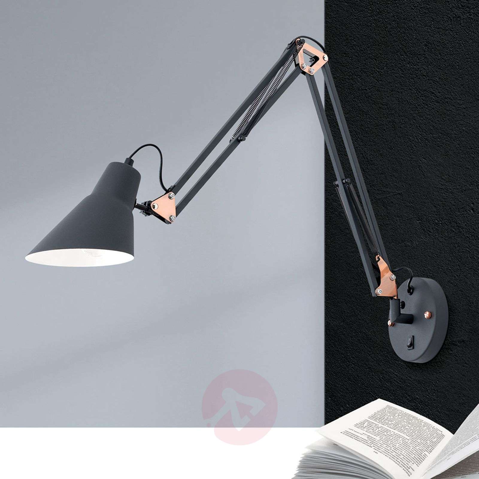 Potrójna regulowana lampa ścienna z naciągiem sprężynowym Bachelor Lampa ścienna Bachelor wykonana ze stali z czarną matową powłoką z farby proszkowej wyposażona jest w regulowane ramię z trzema przegubami. Pozwala to na dopasowanie kierunku padania światła do celu zastosowania. Przeguby są optycznie podkreślone przez matowo-miedzianą powłokę. Piękna głowica lampy jest pomalowana od wewnątrz na biało dla zapewnienia optymalnego odbicia światła. Świetne dodatkowe źródło światła, które – np. po zamontowaniu nad stołem roboczym na ścianie lub nad łóżkiem w sypialni – przekonuje doskonałą wydajnością świetlną. - z przełącznikiem dźwigniowym na armaturze ściennej Klasa efektywności energetycznej: A++