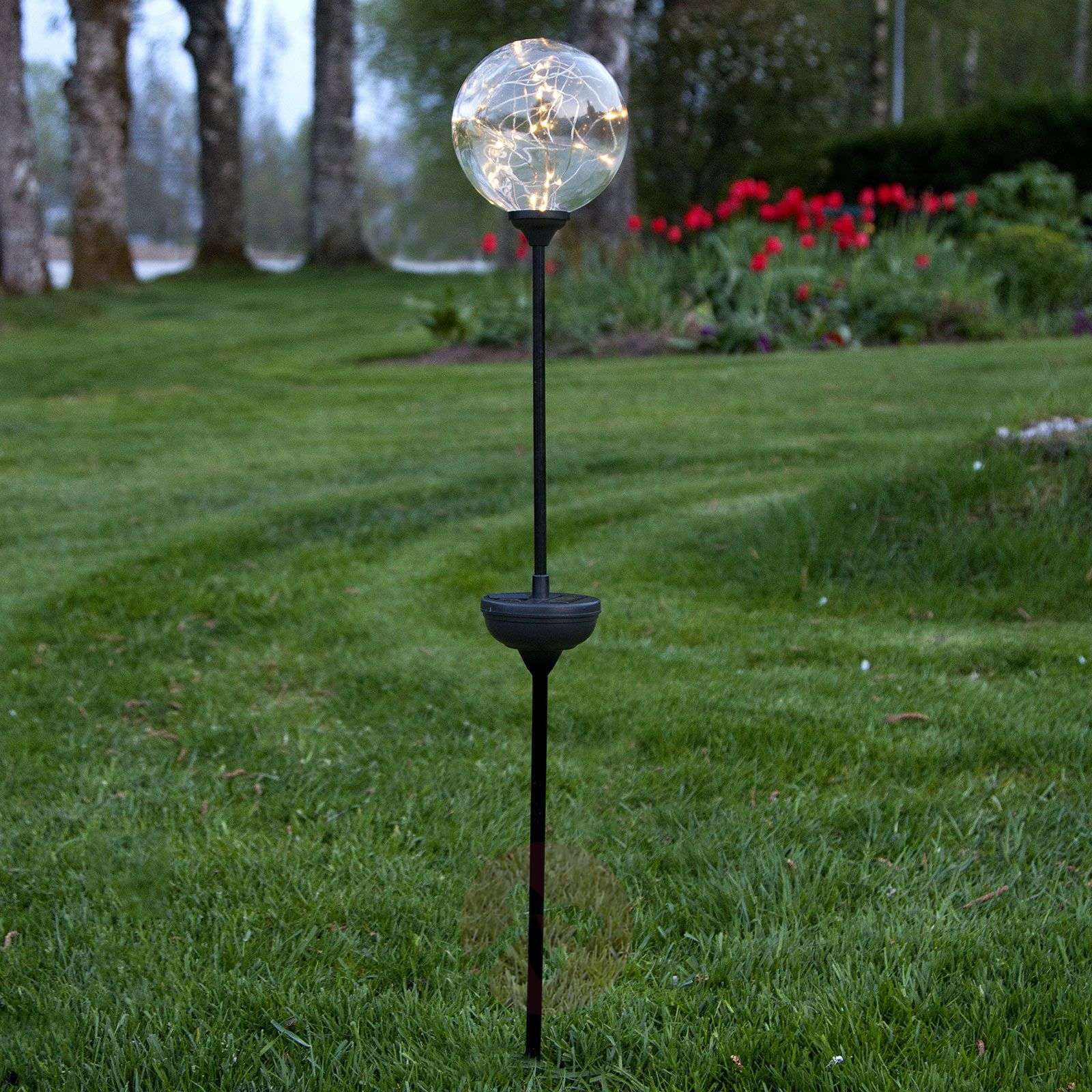 Łańcuch świetlny LED Glory w kulistym kloszu W kulistym kloszu lampy solarnej LED Glory został zwinięty łańcuch świetlny LED. Klosz jest wykończony w taki sposób, że wygląda jak popękane szkło i załamuje światło umieszczonych wewnątrz diod LED. W połowie wysokości grota ziemnego został umieszczony moduł solarny, który wygląda jak platforma. Moduł ten zasila akumulator w ciągu dnia, który z kolei dostarcza energii diodom LED o zmroku. Zintegrowany czujnik zmierzchu steruje lampą automatycznie.