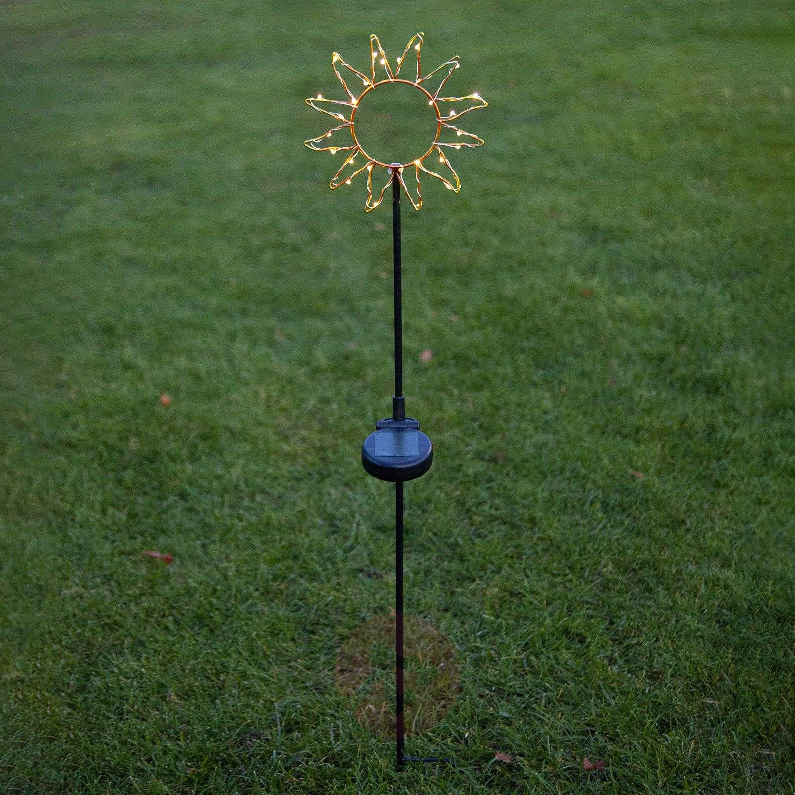 Słoneczne oświetlenie dekoracyjne LED Sunny na ciepłe letnie noce Wytrzymały grot ziemny lampy solarnej LED Sunny posiada w połowie wysokości moduł solarny ze zintegrowanym akumulatorem. Moduł ładuje akumulator w ciągu dnia i dostarcza energię diodom LED w nocy. Po pełnym naładowaniu możliwy jest czas pracy do sześciu godzin. Lampa jest sterowana automatycznie przez czujnik zmierzchu. Na górze znajduje się piękna sylwetka słońca, wypełniona diodami LED. Gdy światło jest włączone, powstaje dyskretny blask światła, stając się prawdziwą atrakcją w ogrodzie.