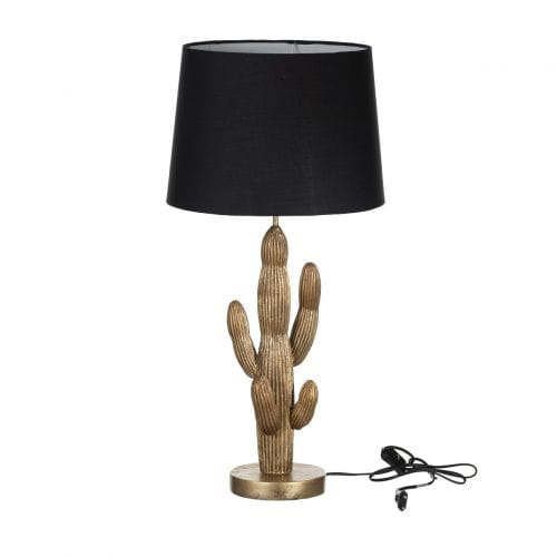 Oryginalna, przykuwająca uwagę lampa stojąca Cactus, to propozycja dla osób lubiących niepowtarzalne dekoracje. Podstawa lampy w złotym kolorze nawiązuje swoim kształtem do egzotycznego kaktusa. Klosz wykonany z czarnej tkaniny nadaje lampie elegancji i harmonizuje całość. Niezwykle efektowna dekoracja, która będzie przykuwała uwagę Twoich gości. Doskonale zaprezentuje się we wnętrzach nowoczesnych, eklektycznych oraz wpisze się w modną stylistykę Urban Jungle. Przeznaczona na żarówkę z gwintem E27 (brak w zestawie). Wymiary: szer. podstawy 16cm, śr. klosza 36cm, szer. całkowita lampy 36cm, gł. całkowita 36cm, wys. podstawy 51cm, wys. całkowita 75cm. Materiał: tworzywo/ tkanina. Kolor: stare złoto/ czarny. Waga: 2kg.