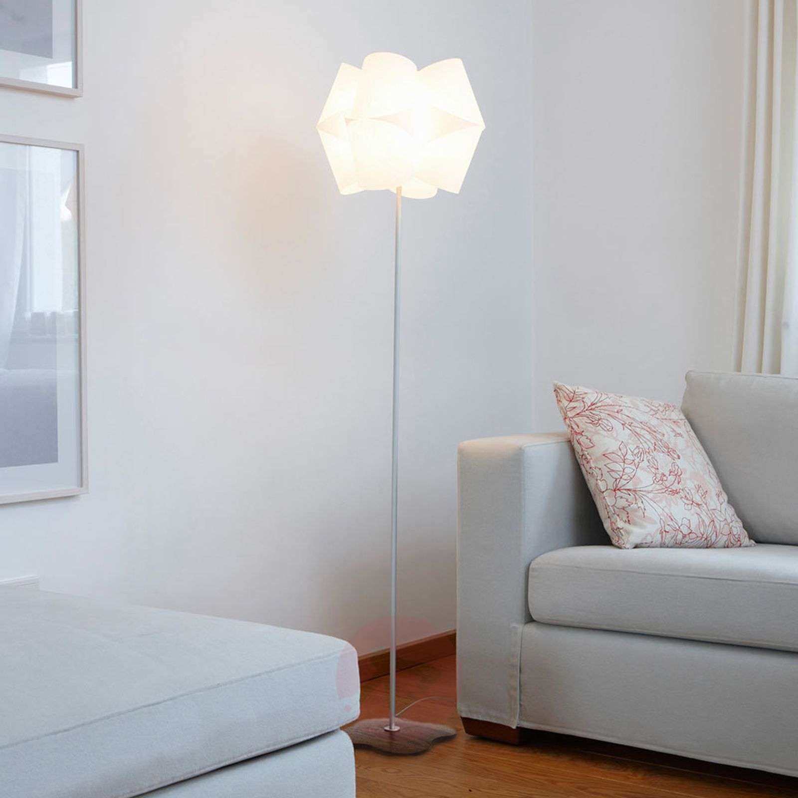 Oryginalna lampa stojąca JULII z kloszem z lunopalu w kształcie chmury Swą formą i rozmiarami lampa stojąca JULII przywołuje na myśl lekkość chmury. Wykonany z lunopalu klosz zapewni w pomieszczeniu, w którym znajdzie się JULII, wymarzone oświetlenie, wypełniając je przytulnym światłem. Wspaniałym dopełnieniem tego niezwykłego designu jest podstawa z orzecha włoskiego w kształcie czterolistnej koniczyny. Lunopal to przypominające papier tworzywo sztuczne, które rozprasza przytulne światło i zachwyca również pod względem funkcjonalności. Jest odporne na promieniowanie UV, niełamliwe oraz nie żółknie i jest łatwe do czyszczenia. Równowaga ekologiczna dzięki ręcznie wykonanym produktom z Niemiec – harmonijna koegzystencja człowieka i przyrody w centrum procesu produkcji oświetlenia Jako producent oświetlenia marka DOMUS może poszczycić się długoletnim doświadczeniem, gdyż powstała w 1966 roku. Od tego czasu nie zmieniła swej filozofii wprowadzania światła do domów, udoskonalając przy tym proces produkcji z zachowaniem wysokiej jakości oraz równowagi ekologicznej. Nawet jeżeli produkcja odbywa się przy pomocy doskonałego pod względem technicznym sprzętu, marka DOMUS uważa się za manufakturę, w której utalentowani ludzie z oddaniem i znawstwem sztuki rzemiosła tworzą ręcznie wysokiej jakości lampy dla innych ludzi. We współpracy z projektantami, znawcami drewna, konstruktorami oraz projektantami oświetlenia powstają ponadczasowe i wytrzymałe pod względem technicznym lampy, które spełniają nawet najbardziej wygórowane oczekiwania klientów. Odpowiedzialność ekologiczna marki DOMUS przejawia się w stosowaniu w dużej mierze naturalnych surowców odnawialnych oraz unikaniu niepotrzebnego transportu w procesie produkcji w Niemczech. Klasa efektywności energetycznej: A++