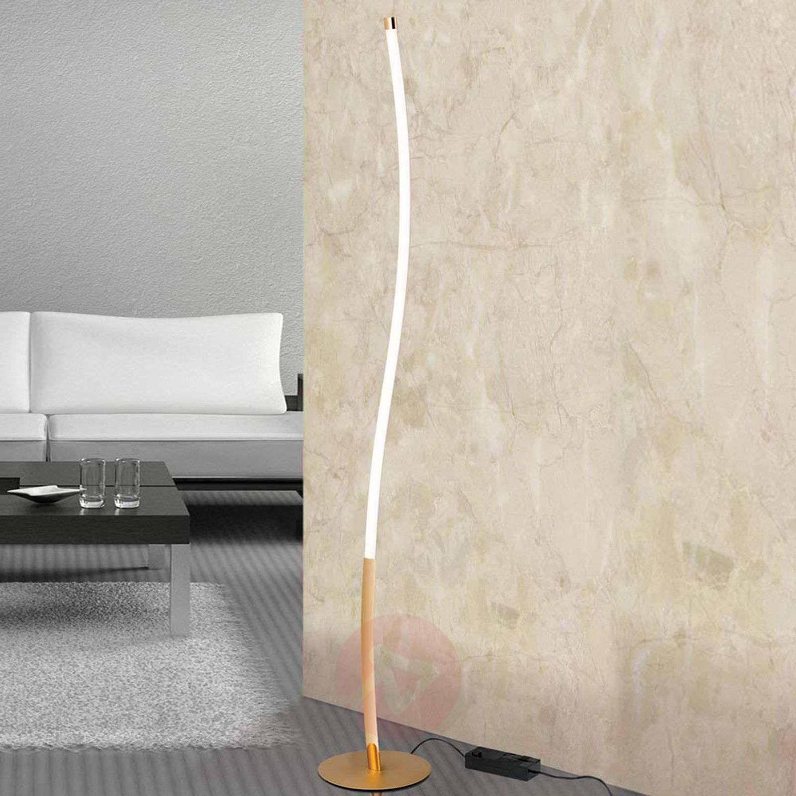 Ekskluzywna lampa stojąca LED Alen ze złotą powierzchnią i ściemniaczem w podstawie Lampa stojąca LED Alen nie tylko wygląda szlachetnie - model ten jest do gruntu szlachetny dzięki korpusowi połyskującemu złotem. Smukły korpus z profilem LED, który rzuca światło w jedną stronę, nadaje tej lampie stojącej bardzo nowoczesny charakter. Wbudowany w podstawie ściemniacz umożliwia indywidualną regulację jasności źródła LED, które przy 100 procentach świeci mocą 1 500 lumenów. Praktyczne, stylowa i szlachetna - oto główne cechy lampy stojącej LED, pozwalającej na modelowanie pomieszczenia światłem i stawiania w nim różnorakich akcentów. Klasa efektywności energetycznej: A+