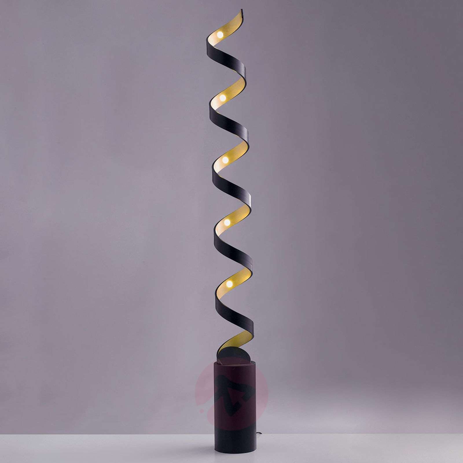 Lampa stojąca LED Helix wywinięta w górę Element świetlny lampy stojącej LED wije się spiralnie od podstawy. Prawie jak wąż, który ucieka z cylindrycznej podstawy przez jej pokrywę i z ciekawością wije się w górę. Z zewnątrz, spirala jest lakierowana w dyskretnej czerni, a wnętrze lśni złotem. Wewnątrz umieszczono niezliczone diody LED, które oświetlają wnętrze i których światło odbija się w postaci złotego blasku. Ta lampa stojąca może być doskonale łączona z innymi lampami z serii i nadaje pomieszczeniu nowoczesną i szlachetną atmosferę. Klasa efektywności energetycznej: A++