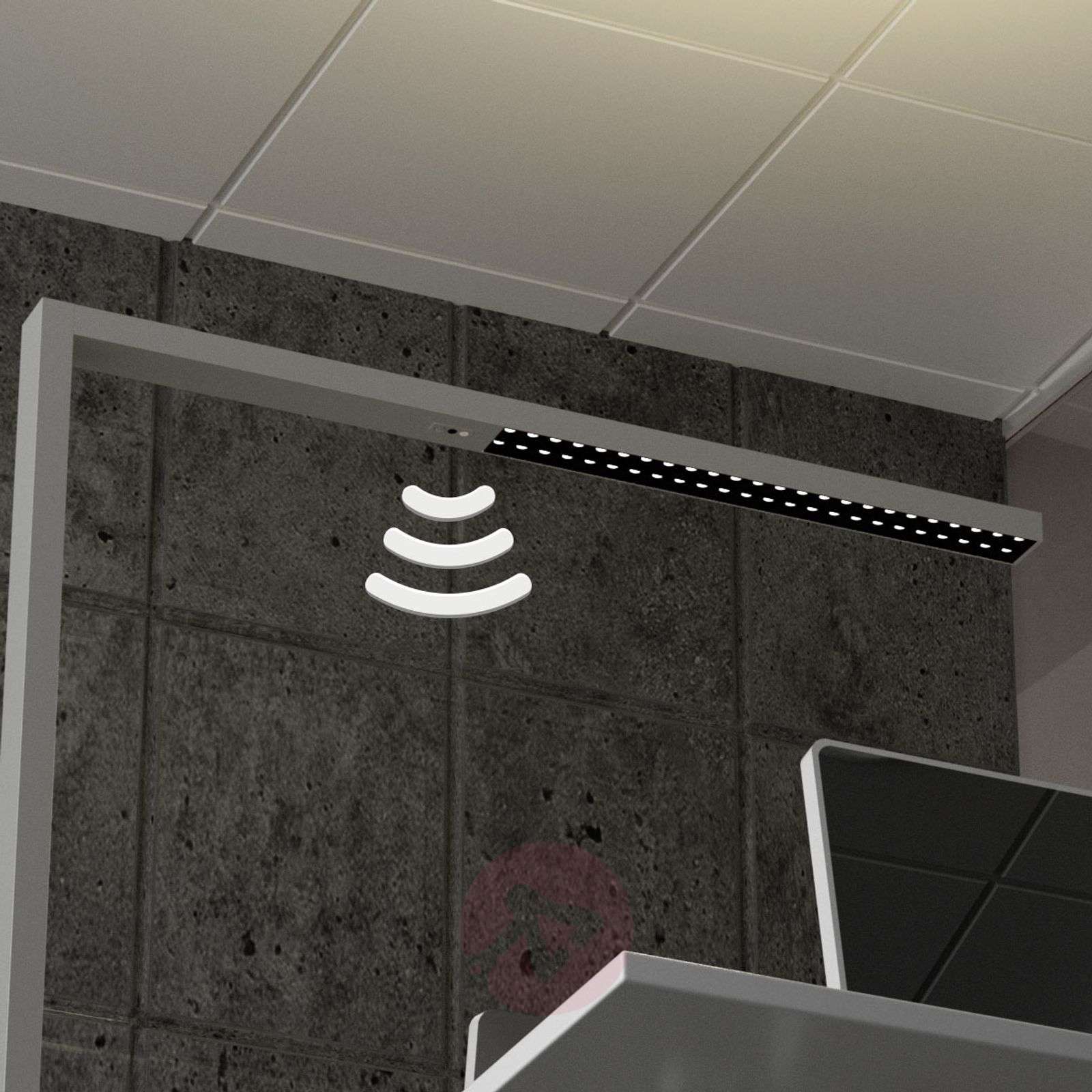 Funkcjonalna biurowa lampa stojąca LED Jolinda z czujnikiem światła dziennego, czujnikiem ruchu, ściemniaczem oraz bezpośrednim i pośrednim rozsyłem światła Jolinda ma pozbawiony detali, bardzo nowoczesny wygląd i w gruncie rzeczy składa się tylko z dwóch wąskich, ustawionych pod kątem prostym drążków. Światło rozchodzi się w górę i w dół, przy czym strumień światła skierowany w dół praktycznie nie oślepia, zapewnia więc przyjemne oświetlenie idealne do długiej, wymagającej skupienia pracy przy biurku. Jasne światło lampy stojącej LED nadaje się również do oświetlania biurka. Na szczególną uwagę zasługuje wysoki stopień funkcjonalności lampy, ponieważ Jolinda jest wyposażona w funkcję ściemniania, a przy tym sterowana za pomocą czujnika światła dziennego i czujnika ruchu. Po trzydziestu minutach braku obecności lampa wyłącza się, a czujnik światła dziennego zapewnia relatywnie stałą jasność w pomieszczeniu, ponieważ światło lampy stojącej LED staje się jaśniejsze lub ciemniejsze w zależności od natężenia światła na zewnątrz. - stopa w formie litery „U” - UGR Klasa efektywności energetycznej: A+
