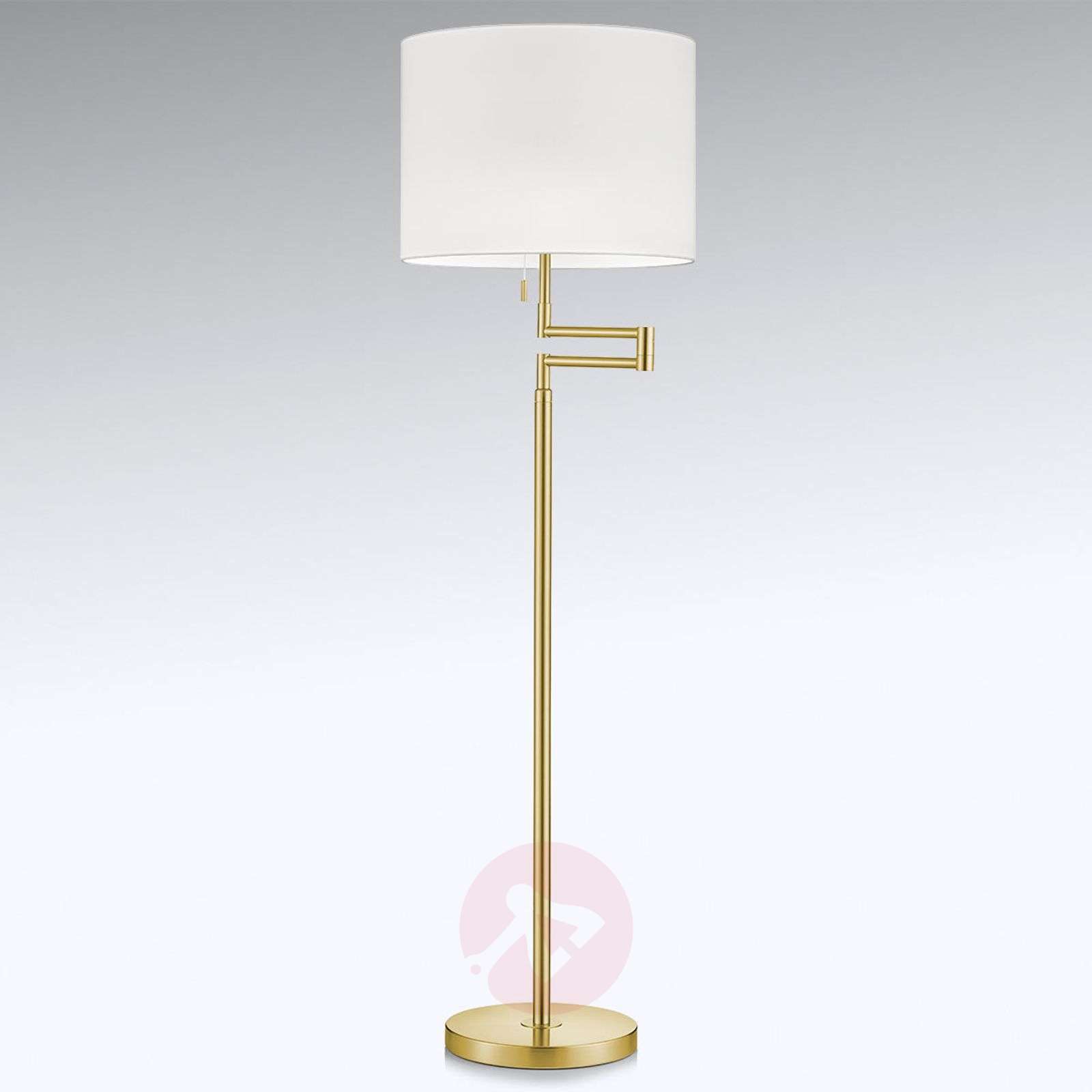 Purystyczna lampa stojąca LED Lilian, regulowana, ściemniana, mosiądz matowy Lampa stojąca LED Lilian z możliwością dowolnego ustawiania przyciąga uwagę wykończeniem o barwie matowego mosiądzu. Dzięki zaawansowanej technologii LED ta lampa jest bardzo energooszczędna. Ta ponadczasowa klasyczna lampa stojąca wzbudza entuzjazm zarówno dużą energooszczędnością, jak i faktem, że ma praktyczny ściemniacz, obsługiwany nogą. Tym samym można uzyskać szczególnie nastrojowe światło. Jako że lampa Lilian ma giętkie ruchome ramię, zawsze zapewni przytulne światło w tym miejscu, w którym chcemy. Obsługa tej lampy stojącej LED jest dziecinnie prosta dzięki praktycznemu wyłącznikowi sznurkowemu. Klosz z tkaniny chintz, mający biały kolor, doskonale współgra z chłodnym metalem. Skandynawska koncepcja wyposażenia i minimalistyczny styl aranżacji pomieszczenia przydają tej prostoliniowej lampie stojącej jeszcze więcej uroku. Klasa efektywności energetycznej: A+