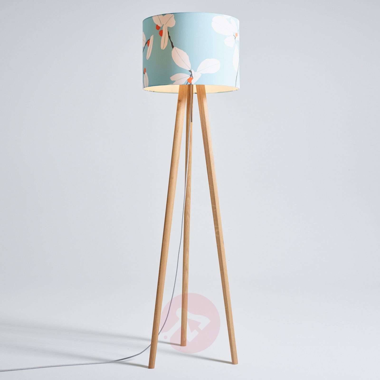 Drewniana lampa stojąca Sten Flower – trójnóg o klasycznym kształcie, z tekstylnym kloszem Ta lampa stojąca Sten flower ma klasyczny wygląd z pewnymi elementami w stylu retro. Posiada trójnożną podstawę z dębu białego i cylindryczny klosz z tkaniny, opatrzony dużym kwiatowym wzorem w stylu lat 60 i 70. Całości wyglądu dopełnia srebrnoszary przewód zasilający z powłoką tekstylną. Przełącznik w kształcie pręcika, znajdujący się pod kloszem, dostarczany jest w dwóch kolorach, czerwonym i srebrnym. Można go wymieniać zgodnie z indywidualnymi upodobaniami. Niemiecki producent opraw oświetleniowych, firma Domus, wytwarzając swoje produkty, dba o to, aby ludzie i środowisko były względem siebie w równowadze, włączając w to zrównoważoną produkcję, krótkie trasy transportowe i przestrzeganie surowych przepisów dotyczących ochrony środowiska. Ponadto producent podczas wytwarzania lamp dba o to, aby nie utracić naturalnego piękna drewna, dlatego też nie używa lakierów, a obróbka powierzchniowa jest przeprowadzana z użyciem olejów roślinnych i naturalnych wosków. Wyprodukowano w Niemczech Klasa efektywności energetycznej: A++