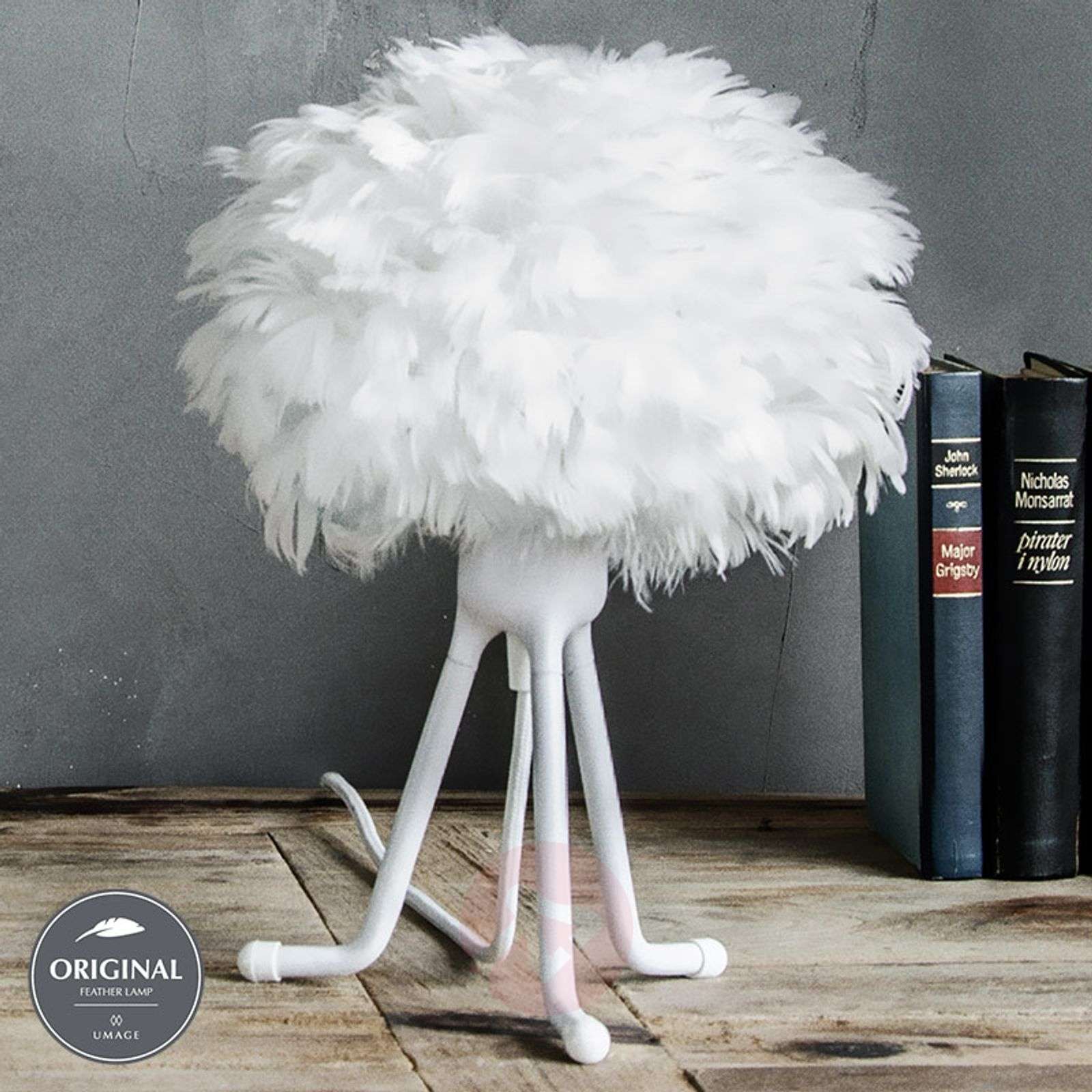 Biała, trójnożna lampa stołowa Eos micro z trzema regulowanymi stopami Lampa stołowa Eos micro ma dwie szczególne cechy: Po pierwsze, jest wyposażona w klosz z prawdziwych gęsich piór, których jest około 500 sztuk, po drugie zaś ma trójnożny statyw, który stanowi jej bazę, a którego wysokość można regulować w zakresie ok. 6 cm. Nogi można łączyć na dwa sposoby. Tutaj designerowi Sørenowi Ravnowi Christensenowi udało się stworzyć projekt, który charakteryzuje się naturalnym pięknem i tym, że emituje bardzo delikatne światło, które jest mile widziane w każdym pomieszczeniu jako nastrojowe oświetlenie dodatkowe. Lampa stołowa Eos micro wyposażona jest w kabel w osłonie tekstylnej (200 cm) oraz przełącznik na kablu. Klosz w razie potrzeby można łatwo wyczyścić suszarką do włosów. UMAGE jest duńską firmą produkującą oprawy oświetleniowe, której współzałożycielem jest designer Søren Ravn Christensen, zaangażowany również w kreatywny rozwój firmy. UMAGE przywiązuje dużą wagę do dalszego rozwoju skandynawskiego designu przy zachowaniu jego funkcjonalności i purystycznego piękna, zgodnie z prawidłami starannego rzemiosła. - Nie użyto tu piór żywych zwierząt. Klasa efektywności energetycznej: A++