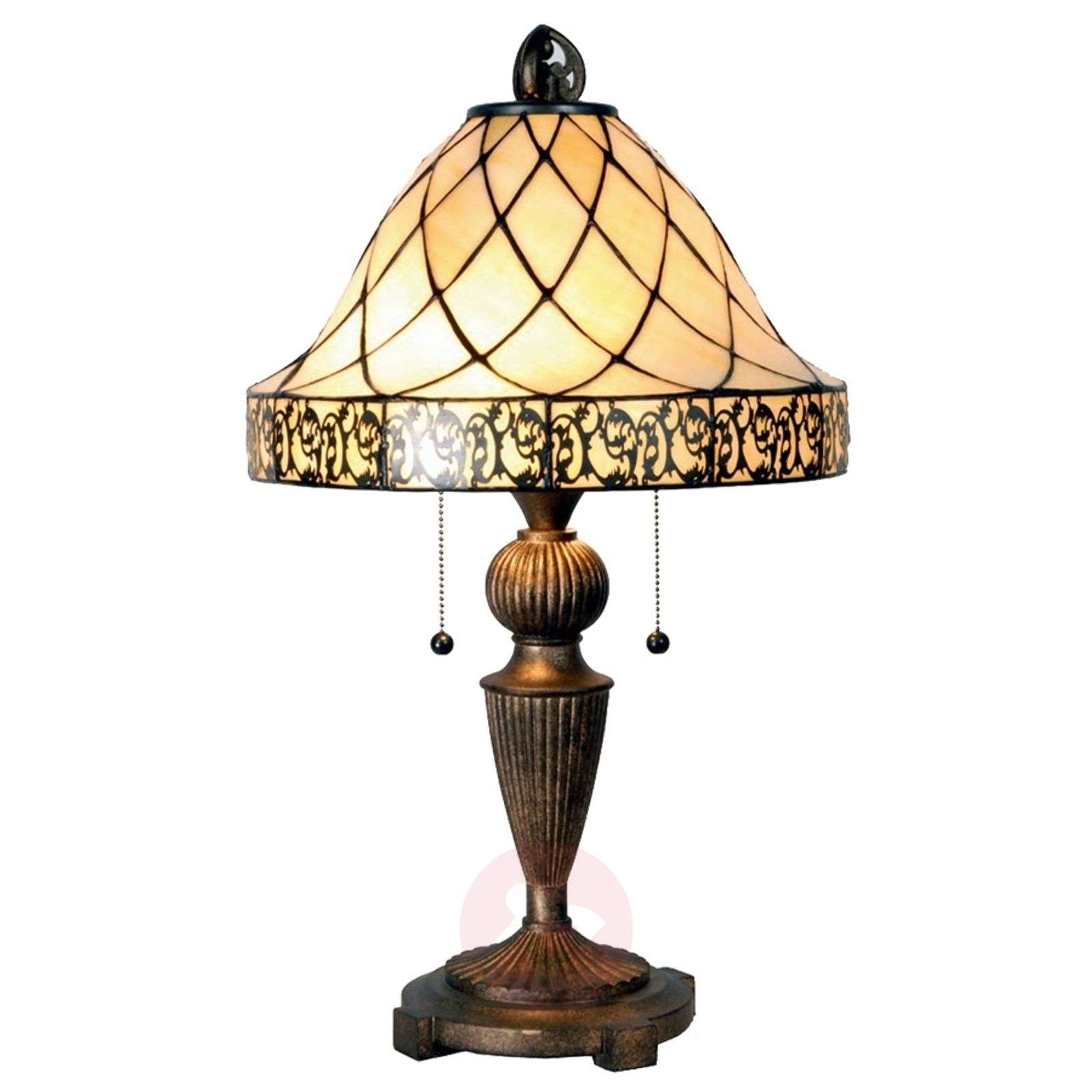 Kremowa lampa stołowa Diamond z wzorem w romby w stylu Tiffany Lampa stołowa Diamond o wysokości 62 cm ma stylowy, kremowy kolor i jest ozdobiona pięknym motywem rombów. Dolna część jest zakończona dekoracyjnym obrzeżem z estetycznym ornamentem. Lampa stołowa Diamond zapewni ciepłe światło, zaś dzięki prostocie wzornictwa będzie pasowała do niejednego wnętrza mieszkalnego, wnosząc do niego współczesne akcenty - gdyż kolor kremowy jest jak najbardziej w modzie. Jej wnosząca wrażenie przepychu noga przyciągnie niejedno spojrzenie, podobnie, jak dwa pociągowe włączniki zakończone kuleczkami do osobnego włączania żarówek. Bardzo harmonijnie prezentująca się lampa stołowa! Klasa efektywności energetycznej: A++
