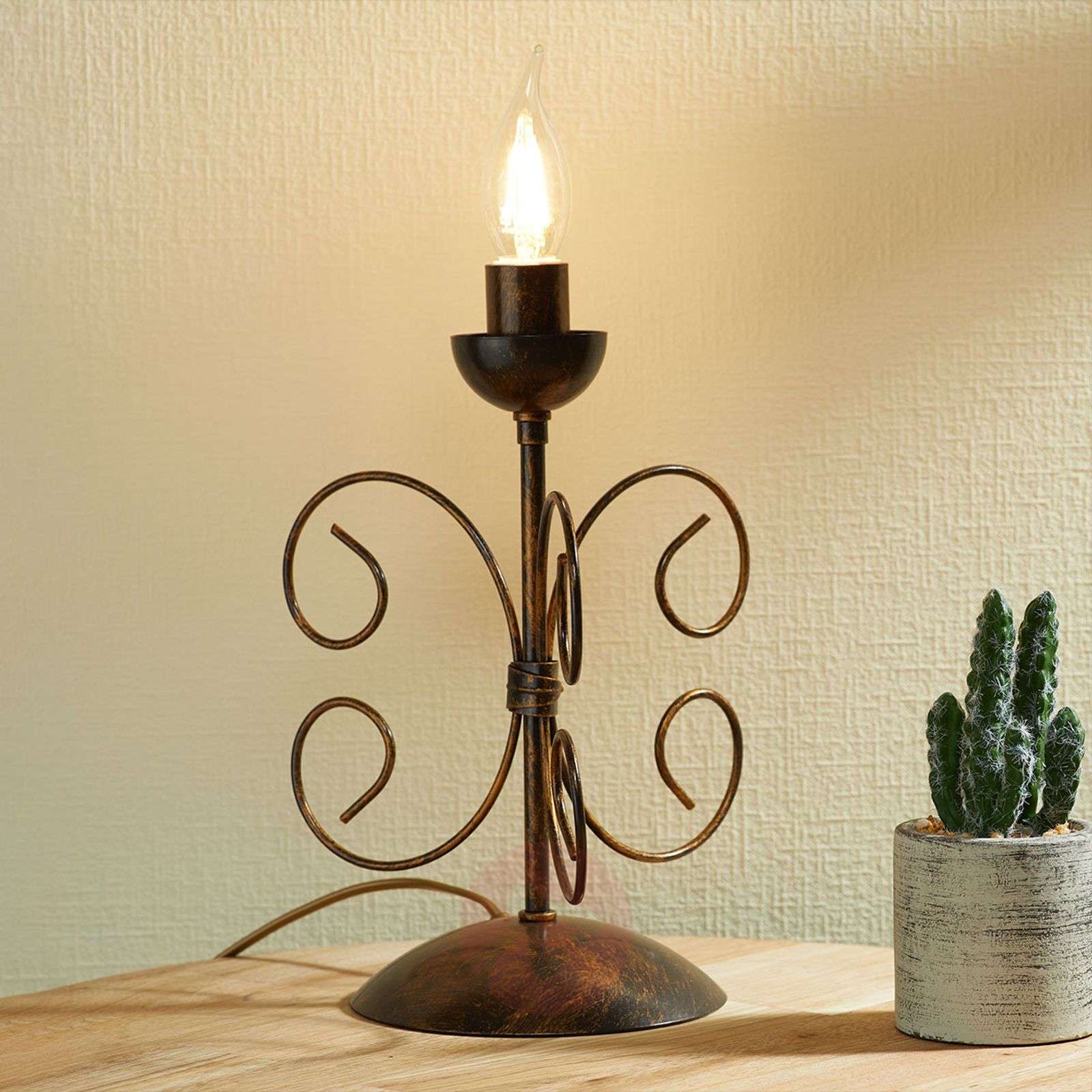 Elegancka lampa stołowa Ennio o dostojnym wyglądzie i powierzchni stylizowanej na starą Podstawę tej lampy stołowej zdobią dwa filigranowe zawijane elementy, znajdujące się po bokach. Nadają one całości wyraz nieco romantyczny. W celu wyposażenia tej żyrandolowej lampy w odpowiednią żarówkę szczególnie warto zaopatrzyć się w żarówki przypominające płomień świecy, gdyż czynią one tę lampę stylową i elegancką zarazem. Przełącznik znajduje się w przewodzie zasilającym, a wykończenie powierzchni, mające barwę starego złota, wygląd bardzo autentycznie i ujmująco. Piękny element do salonu i sypialni. Klasa efektywności energetycznej: A++