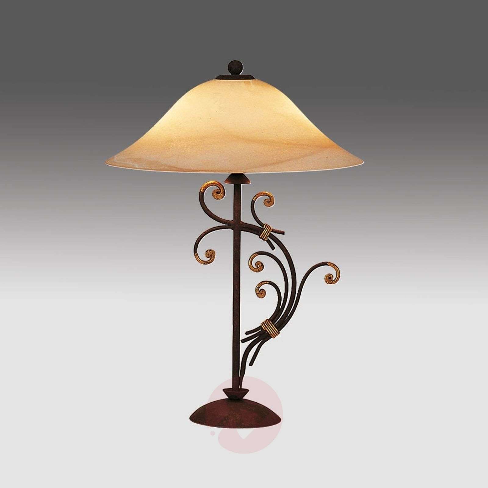Lampa stołowa Florence - pełne przepychu źródło światła Kunsztownie wykończona lampa stołowa Florence to prawdziwa ozdoba: florentyńskie kształty, które obecnie możemy podziwiać jeszcze we włoskich pałacach, zostały wykute ręcznie. Ozdoby ze złota w listkach nie pokrywają powierzchni całkowicie, co dodatkowo wzmacnia klasyczno-antyczne wrażenie. Przepiękny korpus z dymnego szkła Scavo rozsiewa miękkie światło i pozwala na wniesienie nastrojowej atmosfery. Klosze z dymnego szkła Scavo Florentino zostały wykonane na bazie tradycyjnego szkła Scavo. Przez dodanie kropli brązowego szkła, które w trakcie wirowania nierównomiernie zabarwia materiał, powstaje za każdym razem unikatowy klosz. W procesie tym uzyskuje się także nierównomierną powierzchnię. Przez ponowne rozgrzanie klosz traci swój okrągły kształt. Ponadto, jest on cięższy, niż szkło dmuchane ustnie. Te wysokiej jakości, wyprodukowane w Europie lampy, są wykonane ręcznie z naturalnych materiałów i wyróżniają się bardzo wysoką jakością. Niewielki nakład produkcji pozwala na zachowanie indywidualności, różnorodności i wyjątkowości produktów. Klasa efektywności energetycznej: A++