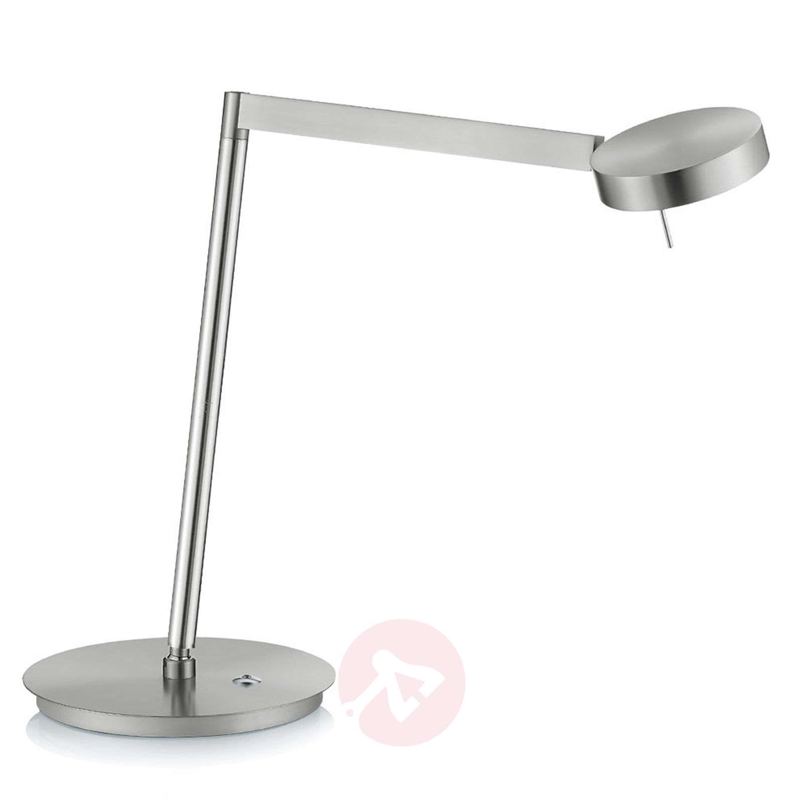 Energooszczędna lampa stołowa LED Reading, nikiel, ze ściemniaczem w postaci przycisku Ta energooszczędna lampa stołowa Reading spełnia wszystko, co zawarte jest w jej nazwie. Purystyczna lampa stołowa LED to tak naprawdę lampka do czytania, którą można wygodnie regulować za pomocą praktycznego ściemniacza w postaci przycisku. Kompaktowa lampa doskonale sprawdza się zarówno na stoliku nocnym, jak i na biurku czy stoliku dodatkowym. Nowoczesna lampa stołowa Reading z metalowymi elementami emituje skupione światło w ściśle określone miejsce. Z racji konsekwentnie utrzymanego designu z elementami metalowymi, ta klasyczna lampa nie wysuwa się pierwszy plan, ale dyskretnie i ponadczasowo pięknie integruje się z istniejącą koncepcją aranżacji pomieszczenia. Dzięki temu nawet fanom minimalizmu lampa Reading z pewnością się spodoba. Klasa efektywności energetycznej: A+