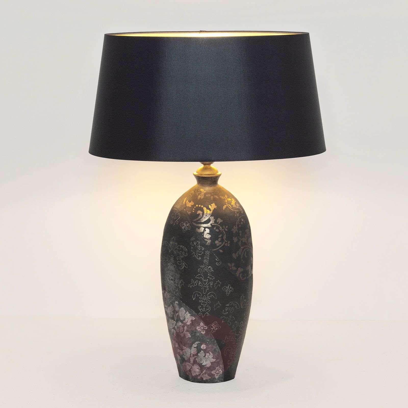 Ceramiczna lampa stołowa Mary w kolorze czarno-srebrno-złotym Lampa stołowa Mary przekonuje udanym połączeniem szlachetnego wzornictwa i wysokiej jakości materiałów. Strukturyzowany fundament ceramiczny jest centralnym punktem tej lampy i podkreśla jej antyczny charakter. Owalna podstawa, podobna do wazy, uchodzi do ramy, która jest otoczona czarnym, lekko stożkowym kloszem. Jest ona utrzymana wewnątrz w złotej optyce, co dodatkowo podkreśla szlachetny wygląd lampy i przyjemnie odbija światło żarówki. Dzięki strukturze i czarno-srebrno-złotej kolorystyce lampa ta nadaje się szczególnie do klasycznych stylów wyposażenia wnętrz. Klasa efektywności energetycznej: A++