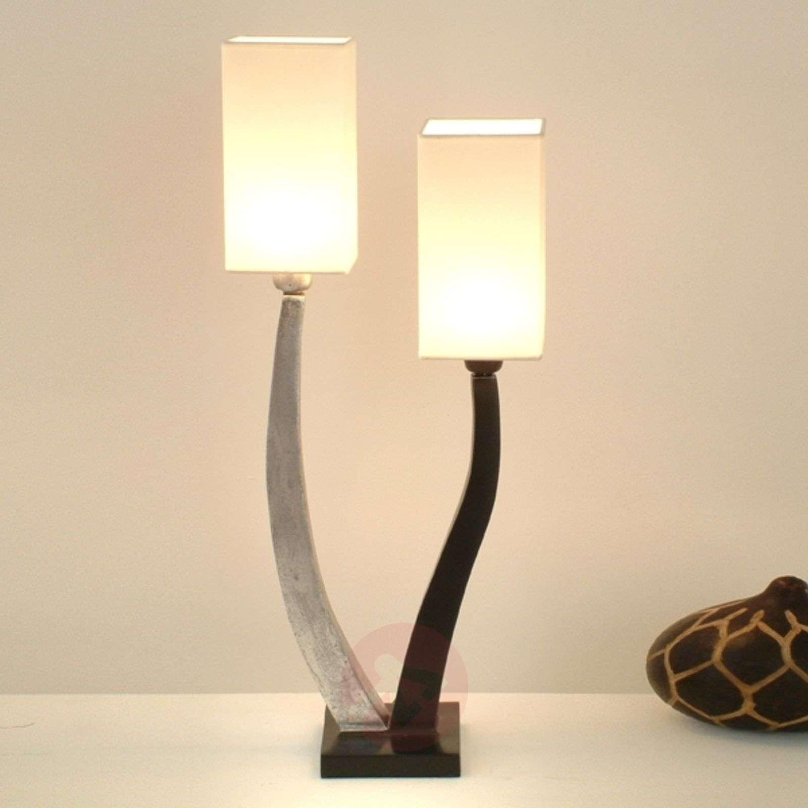 Lampa stołowa QUADRANGOLARE SILBER ze srebrną i czarną podstawą i dwoma kloszami Ta lampa stołowa wyposażona w srebrną i czarną podstawę i dwa kwadratowe klosze jest prawdziwym obiektem przyciągającym wzrok. Obydwa delikatnie wygięte klosze są efektownie do siebie nachylone i tworzą dekoracyjne akcenty. To pełne kontrastów połączenie koloru czarnego ze srebrnym jest bardzo udane. Klasa efektywności energetycznej: A++
