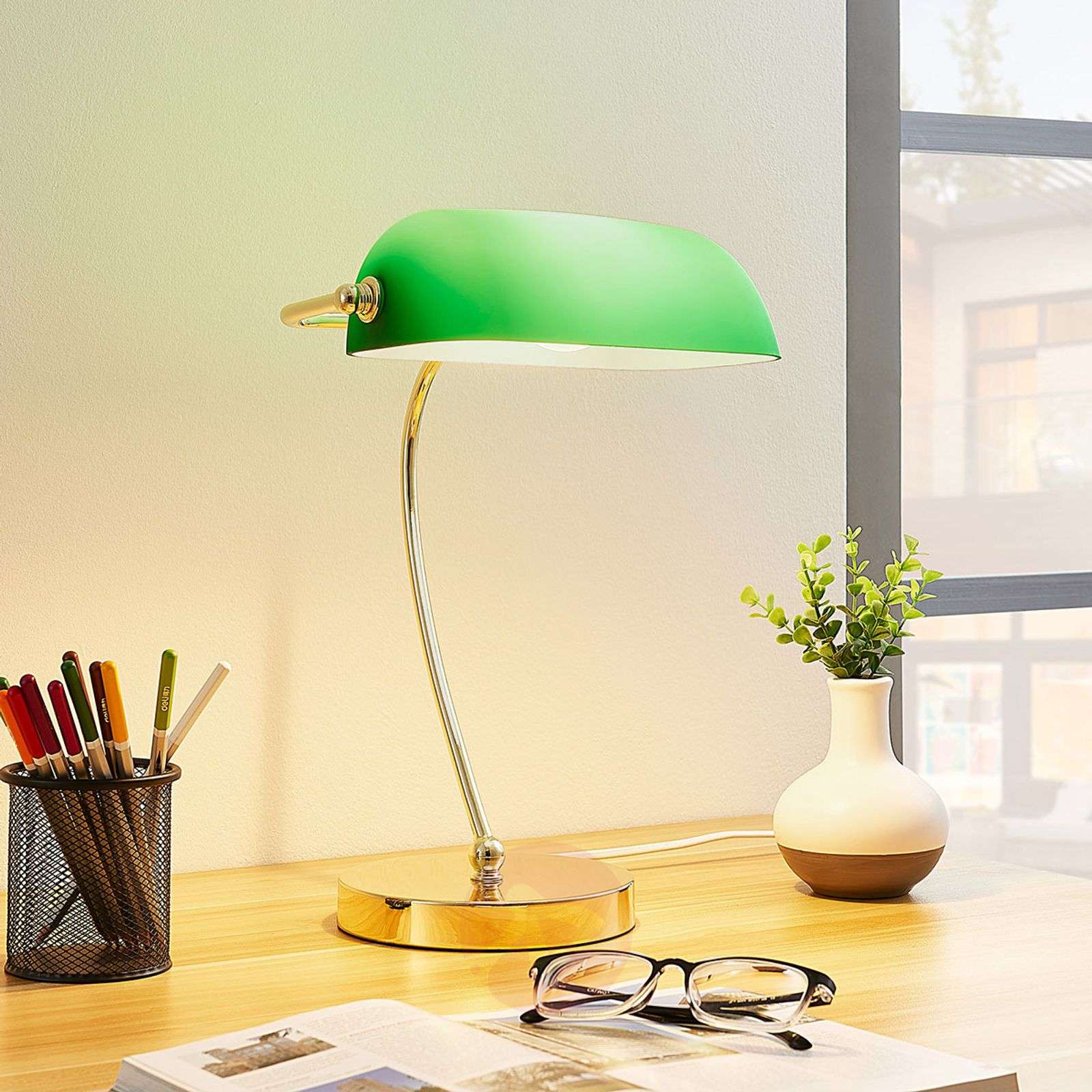 Lampa biurkowa Selea w stylu klasycznej lampy bankierskiej z barwionym na zielono szklanym kloszem i metalową podstawą w kolorze mosiądzu Lampa bankierska roztacza swego rodzaju urok nostalgii, ponieważ jest całkowicie utrzymana w stylu takich lamp, jakie można było zobaczyć wszędzie w centrach finansowych dużych miast, zwłaszcza Wall Street w Nowym Jorku, na początku ubiegłego stulecia. Konstrukcja z zielonym, wydłużonym szklanym kloszem ma tę zaletę, że w otoczeniu lampy rozchodzi się bardzo mało światła, gdyż większa jego część niewielkie światło otoczenia, a światło koncentruje się na powierzchni biurka, dzięki czemu dokumenty i inne papiery mogą być dobrze oświetlone i można je wygodnie przeczytać. Jako źródło światła polecana jest tu żarówka LED z technologią filamentową, ponieważ doskonale komponuje się z tradycyjnym wyglądem lampy, gdyż do złudzenia przypomina klasyczną żarówkę. Z kablem o długości 1,8 m i przełącznikiem w kablu zasilającym. Klasa efektywności energetycznej: A++