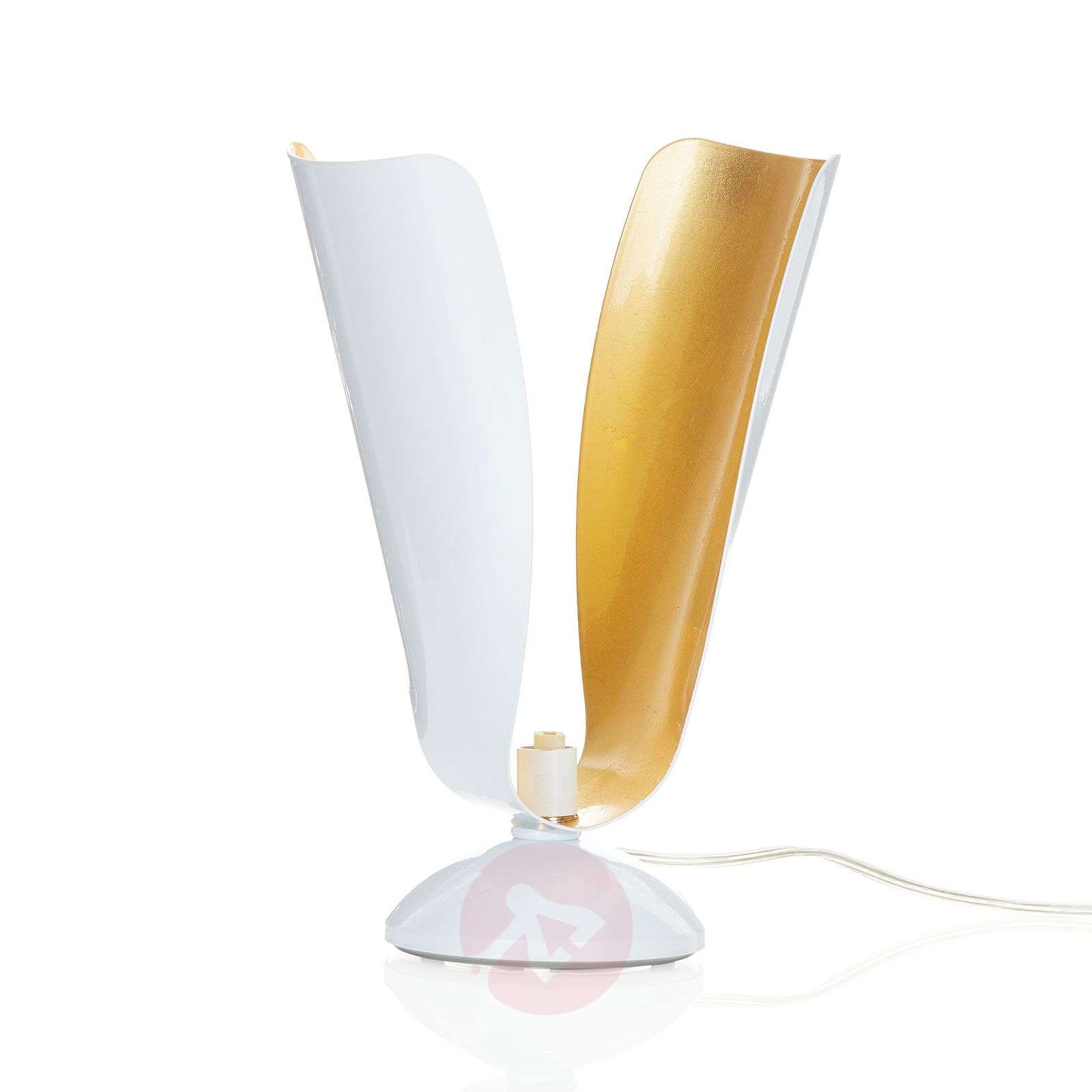 TROPIC – designerska lampa stołowa ze złotem płatkowym Ekstrawaganckie lampy z serii TROPIC są wykonane z wygiętych metalowych elementów, które zostały na zewnątrz pokryte białym lakierem, a od wewnątrz złotem płatkowym. Umieszczona wewnątrz metalowego klosza żarówka halogenowa emituje przyjemne, lśniące światło, tworząc w pomieszczeniu atmosferę luksusu. Klasa efektywności energetycznej: A++