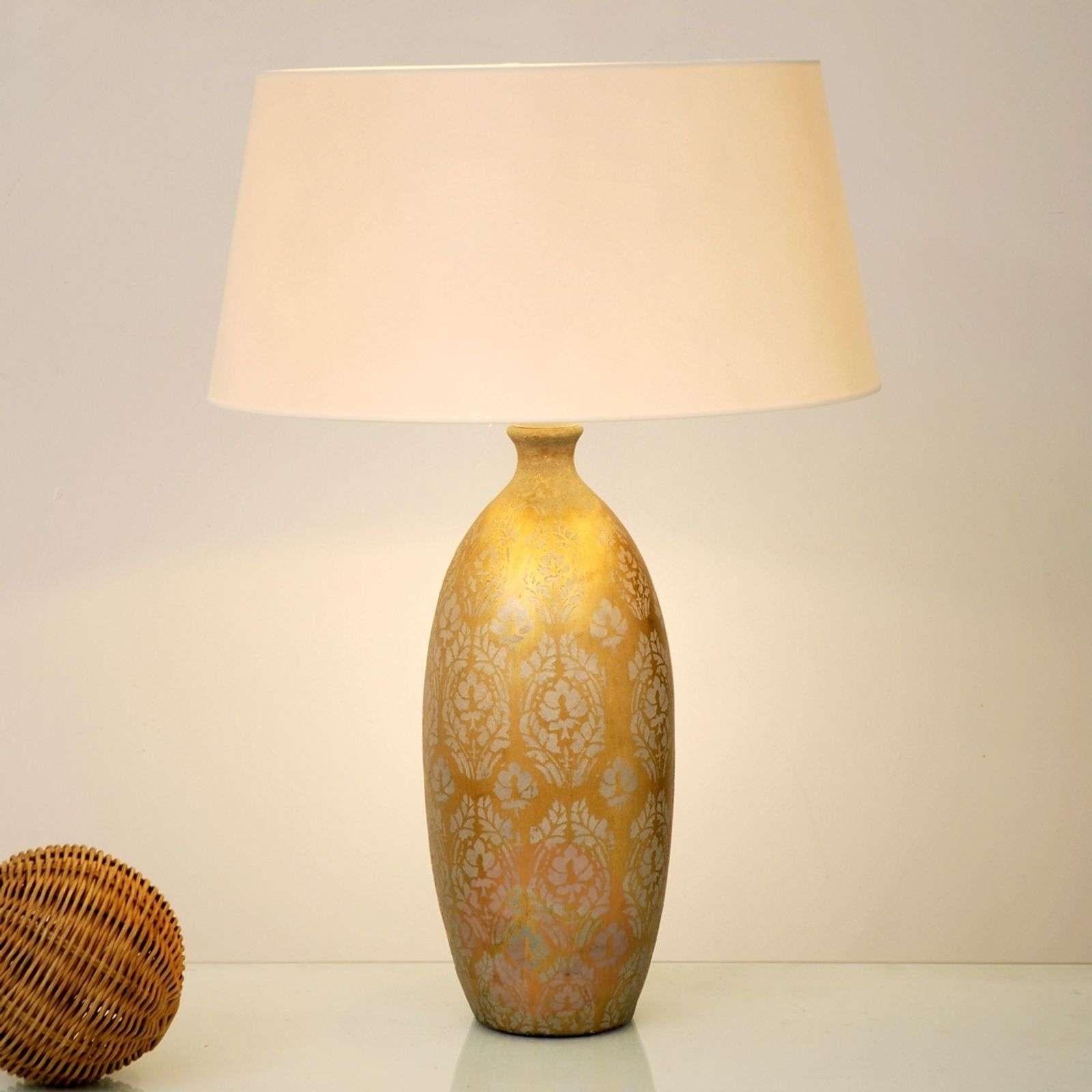 Lampa stołowa Vaso Barocco z ceramiki i tkaniny Stylowa, autentyczna i szlachetna - tak właśnie wygląda lampa stołowa Vaso Barocco. Jej jasny tekstylny klosz w kolorze écru przybiera ponadczasowy, otwarty w pionie, cylindryczny kształt. Wysoka, przypominająca wazon ceramiczna stopa w złotym kolorze podstawowym jest uszlachetniona srebrnym wzorem brokatu. Vaso Barocco jest zatem odpowiednim akcesorium oświetleniowym do klasycznych i ekskluzywnych wnętrz. Klasa efektywności energetycznej: A++