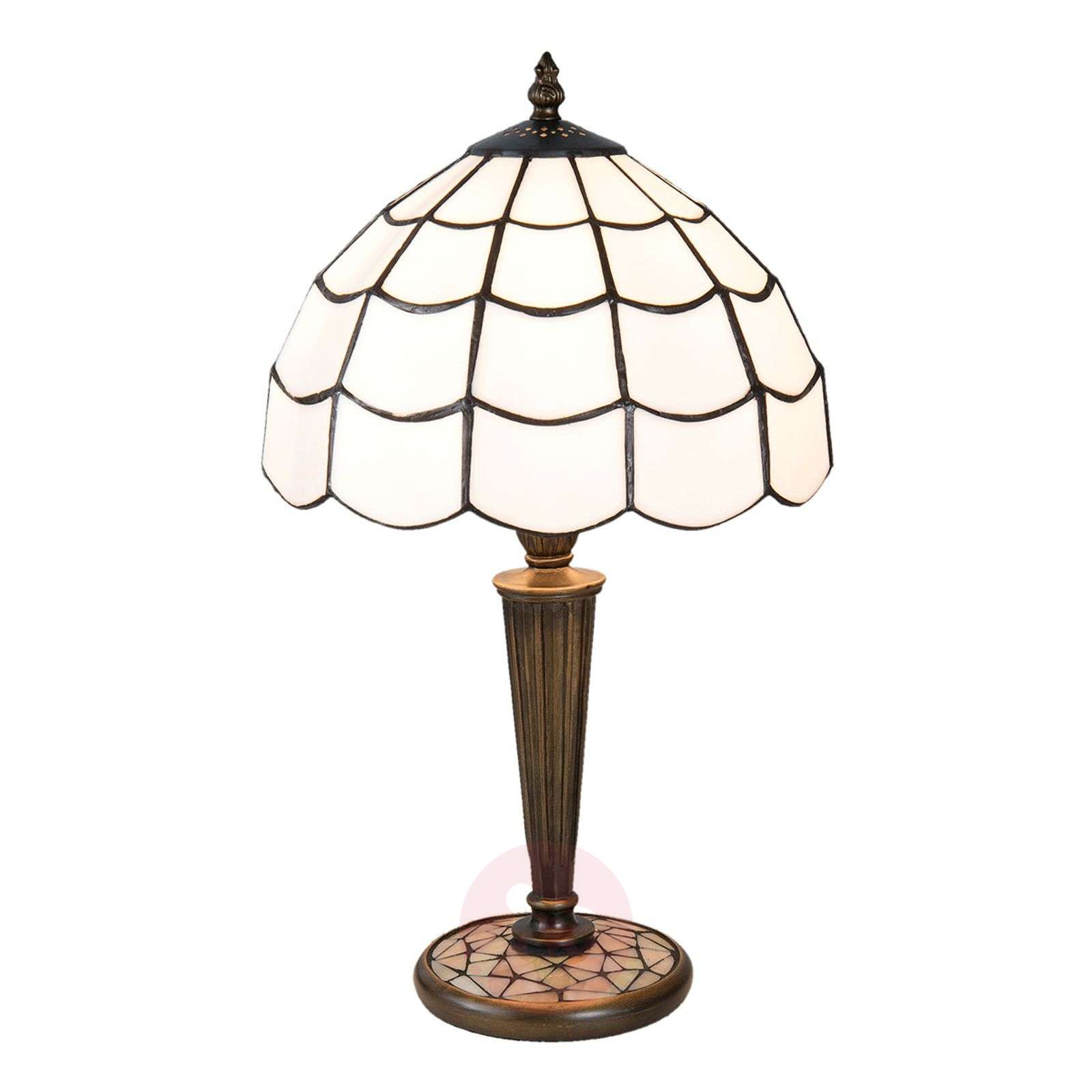Klasyczna lampa stołowa Wiebke z kloszem w stylu Tiffany Struktura klosza, który składa się z wielu małych szklanych elementów, jest powszechnie znana jako ikona stylu Tiffany. Klosz lampy stołowej Wiebke wykonany jest w tym właśnie stylu i składa się z małych, białych szklanych płytek. Brązowa podstawa ma również mozaikowy wzór z iryzujących szklanych płytek. Lampa stołowa Wiebke doskonale wygląda jako źródło oświetlenia dodatkowego, na przykład na komodzie lub małym stoliku, nawet wtedy, gdy światło jest wyłączone. Klasa efektywności energetycznej: A++