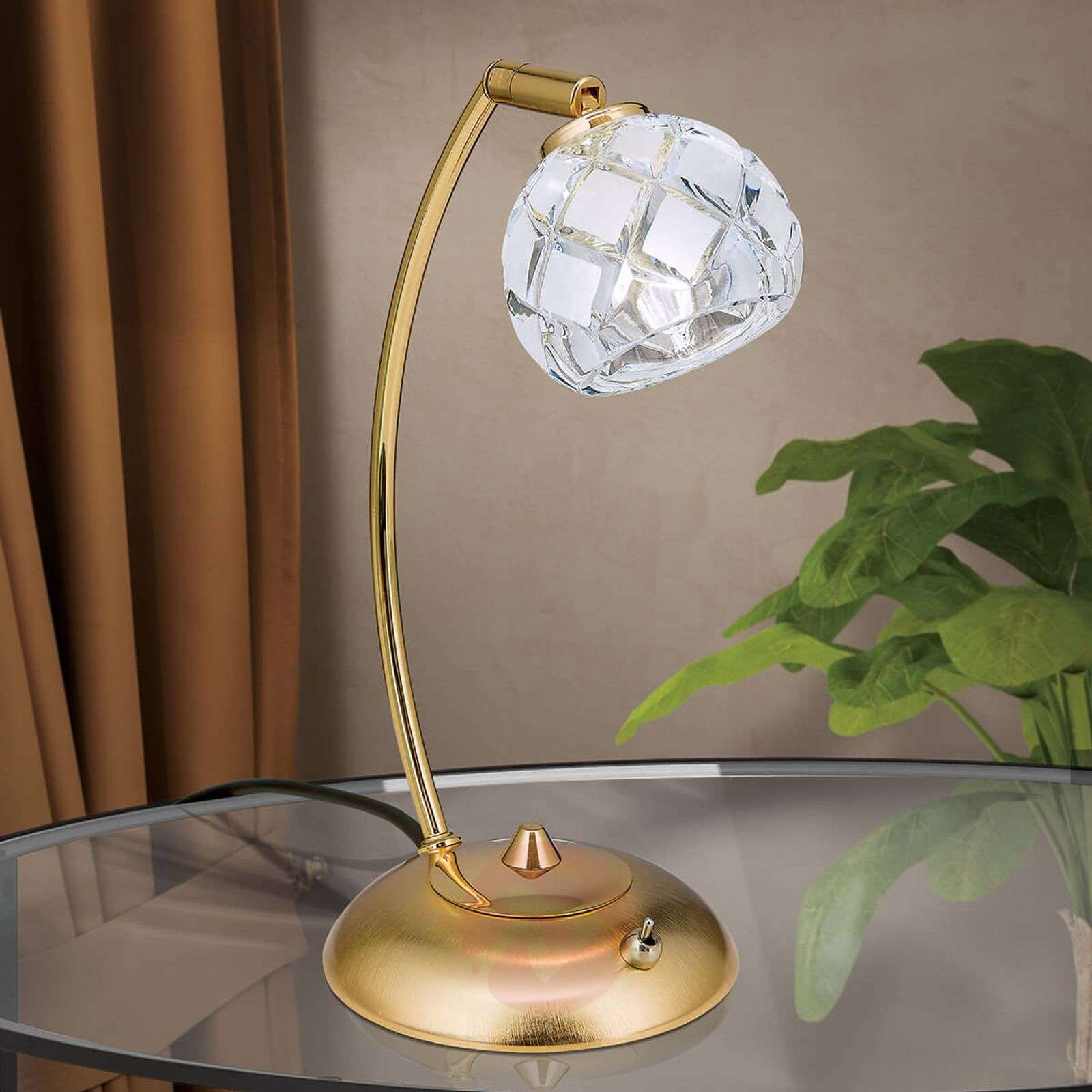 Lampa stołowa Maderno z kryształu ołowiowego, wyprodukowana w Austrii Lampa stołowa Maderno przekonuje do siebie w pełni materiałami wykorzystanymi do jej stworzenia oraz jakością wykonania. Podstawa wykonana jest z litego mosiądzu o delikatnym złotym wykończeniu, częściowo błyszcząca, częściowo matowa. Stopa i ramię są zwieńczone kloszem z kryształowego szkła ołowiowego, który jest zamocowany na przegubie kulowym. Szkło jest wyposażone w romboidalny szlif diamentowy, co daje w efekcie satynowane i przezroczyste powierzchnie w obrębie klosza. Ta lampa stołowa ma bardzo praktyczny przełącznik dźwigniowy, umieszczony na stopie. Maderno to seria opraw, która należy do lamp premium tego producenta. Są one wytwarzane w Austrii ręcznie i poddawane wielu procesom testowania przed wysłaniem produktów końcowych do klientów. Firma kontynuuje tę tradycję rzemieślniczą z pokolenia na pokolenie od prawie 70 lat. Wysokiej jakości materiały i wykonanie przez wykwalifikowanych rzemieślników gwarantują trwałość produktu. Klasa efektywności energetycznej: A++