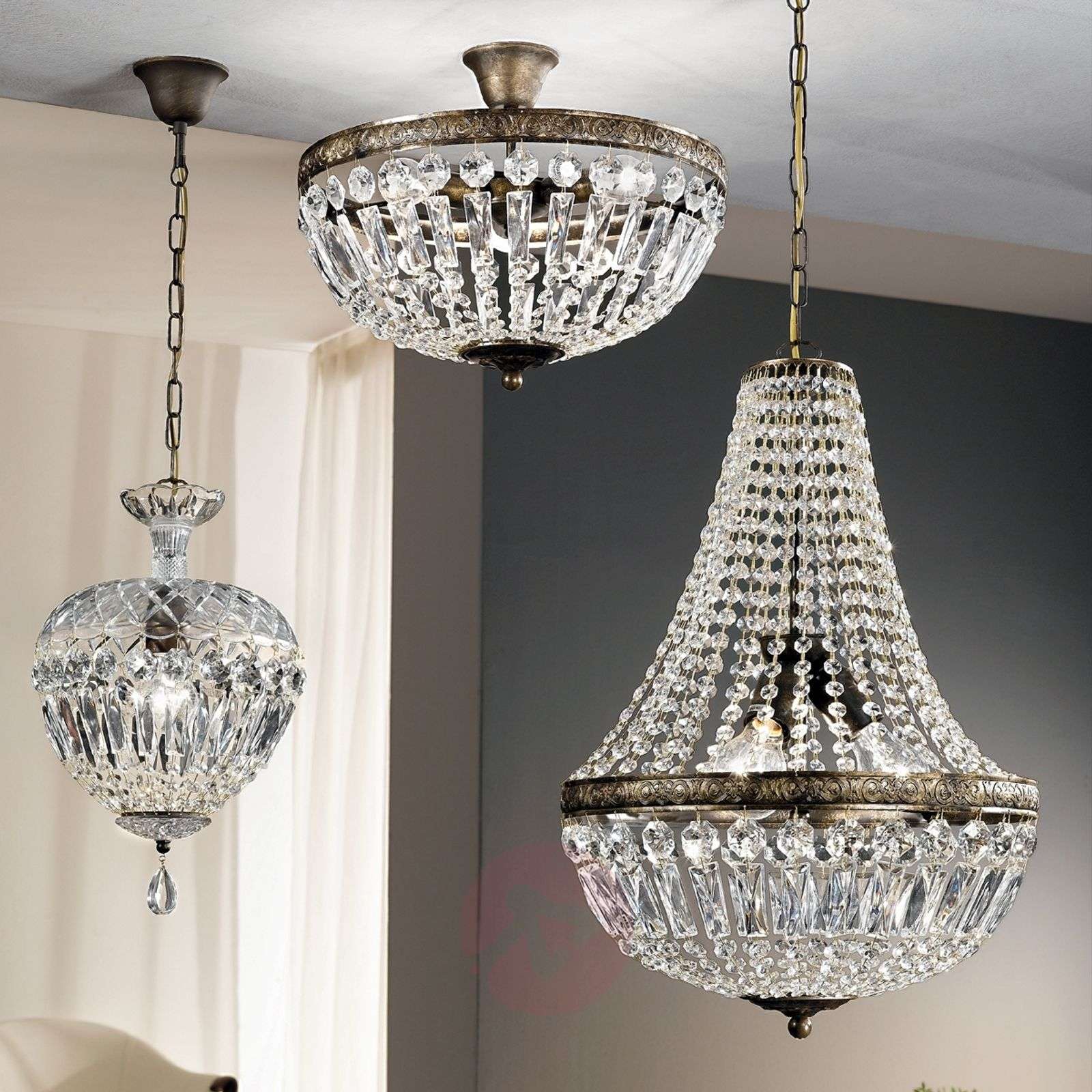 Czarująca lampa sufitowa Andara, imitacja kryształu Lampa sufitowa ozdobiona niezliczoną ilością szklanych kryształów o różnych kształtach od razu wpada w oko i zachwyca wspaniałym wyglądem oraz zwodniczo prawdziwym antycznym wykończeniem. Szklane kryształy odbijają emitowane światło i tworzą efekt połyskiwania. Niezwykła lampa wspaniale komponuje się na przykład ze starymi meblami z ciemnego drewna. Klasa efektywności energetycznej: A++