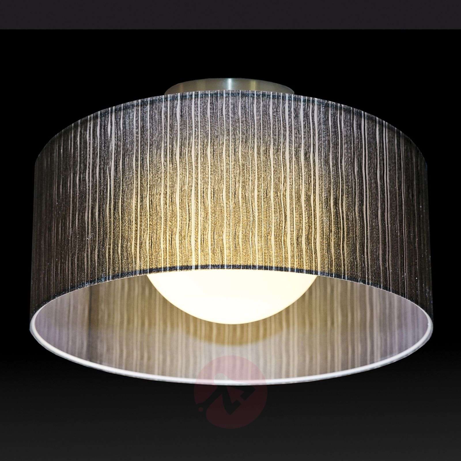 Stylowa lampa sufitowa Ganzo z wysokiej jakości abażurem z tkaniny organza Lekko połyskujący i przepuszczający światło abażur z organzy w czarnym kolorze nadaje lampie sufitowej Ganzo szczególny charakter. Dzięki niemu lampa tworzy nastrojowe i wyjątkowo ciekawe światło, które idealnie rozprasza wewnętrzny biały abażur. Nad stołem w jadalni, czy też zestawem wypoczynkowym w pokoju dziennym - lampa sufitowa Ganzo urzeka harmonijnym światłem, wysokiej jakości materiałami i doskonale komponuje się z różnymi stylami aranżacji wnętrz. Lampa dostępna jest w dwóch dyskretnych odcieniach - czarnym i brązowym. Klasa efektywności energetycznej: A++