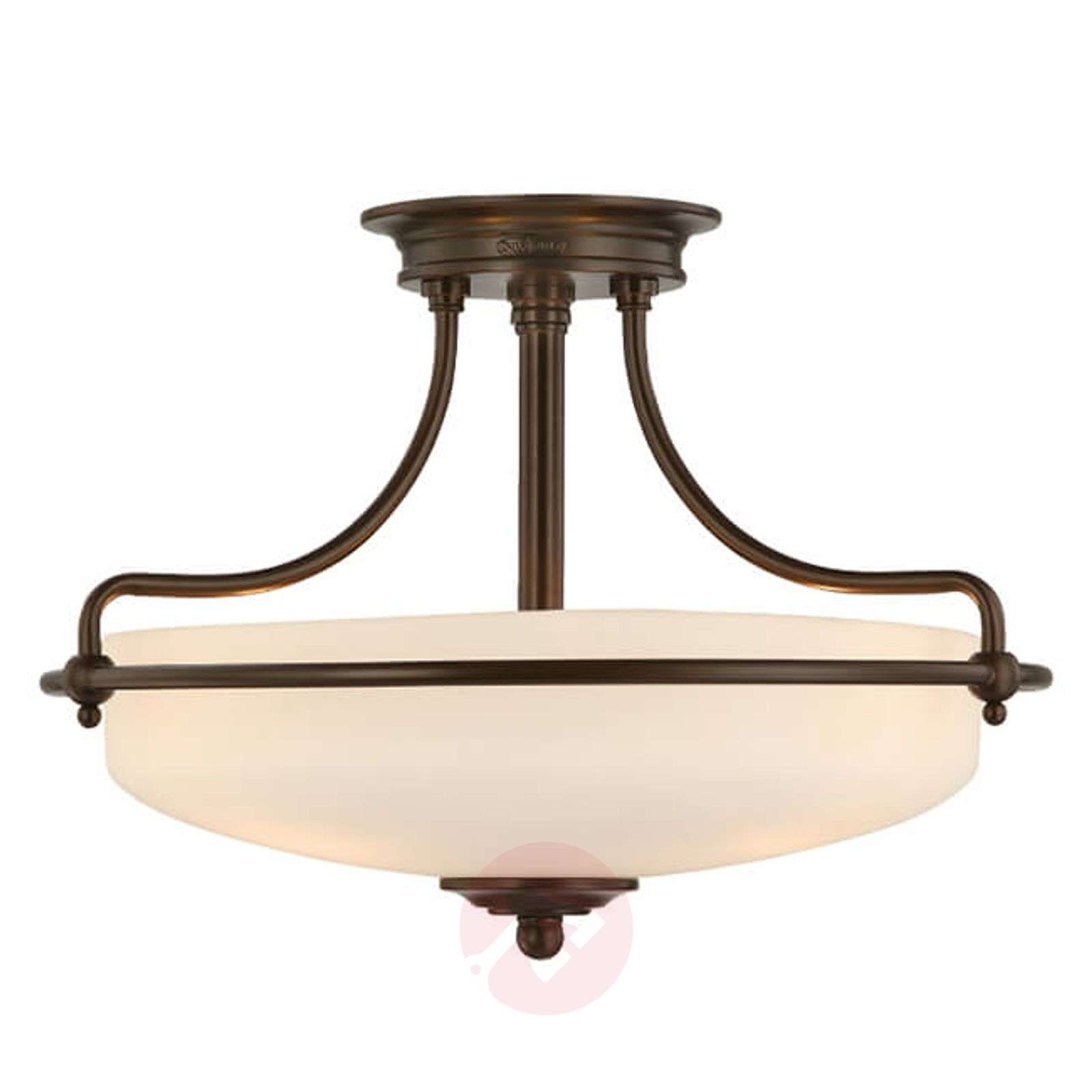 Atrakcyjnie zaprojektowana lampa sufitowa Griffin Ta piękna lampa sufitowa wygląda bardzo reprezentacyjnie nie tylko ze względu na swoją średnicę, wynoszącą ponad 40 cm, ale także z racji stylowego designu z pięknym szklanym kloszem, lakierowanym wewnątrz na biało, oraz wygiętą podstawą, której nadano wykończenie o nazwie „palladian bronze”. Lampa sufitowa Griffin zapewnia dobrze zbalansowane, przytulne oświetlenie pomieszczenia i nadaje się do wielu wariantów wyposażenia. Klasa efektywności energetycznej: A++