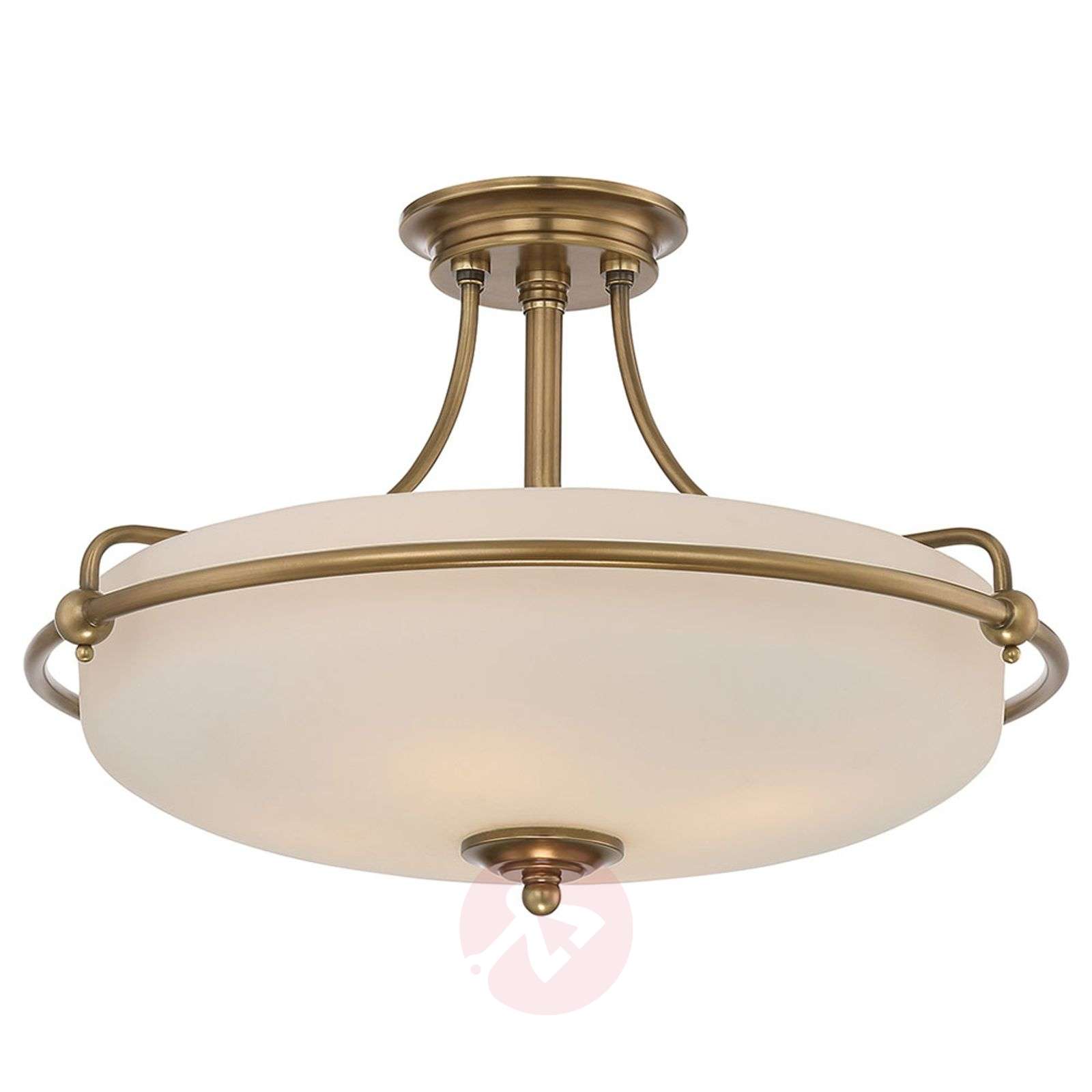 Mosiężna lampa sufitowa Griffin w kolorze mosiądzu z dużym szkłem Lampa sufitowa Griffin jest optyczną atrakcją dla każdego klasycznie zainspirowanego stylu urządzenia mieszkań. Wysokiej jakości lampa sufitowa Quoizel wyposażona jest w atrakcyjnie zakrzywioną podstawę, w której mieści się duża obudowa lampy wykonana z wytrawionego szkła. Mocowanie sufitowe, podobnie jak element końcowy w środku szyby, ma mosiężne wykończenie, które wygląda na lekko zwietrzałe. Wnętrze szkła jest utrzymane w kolorze białym, dzięki czemu światło używanych żarówek jest lepiej odbijane. Rezultatem jest zrównoważone oświetlenie ogólne z atmosferycznym akcentem. Klasa efektywności energetycznej: A++