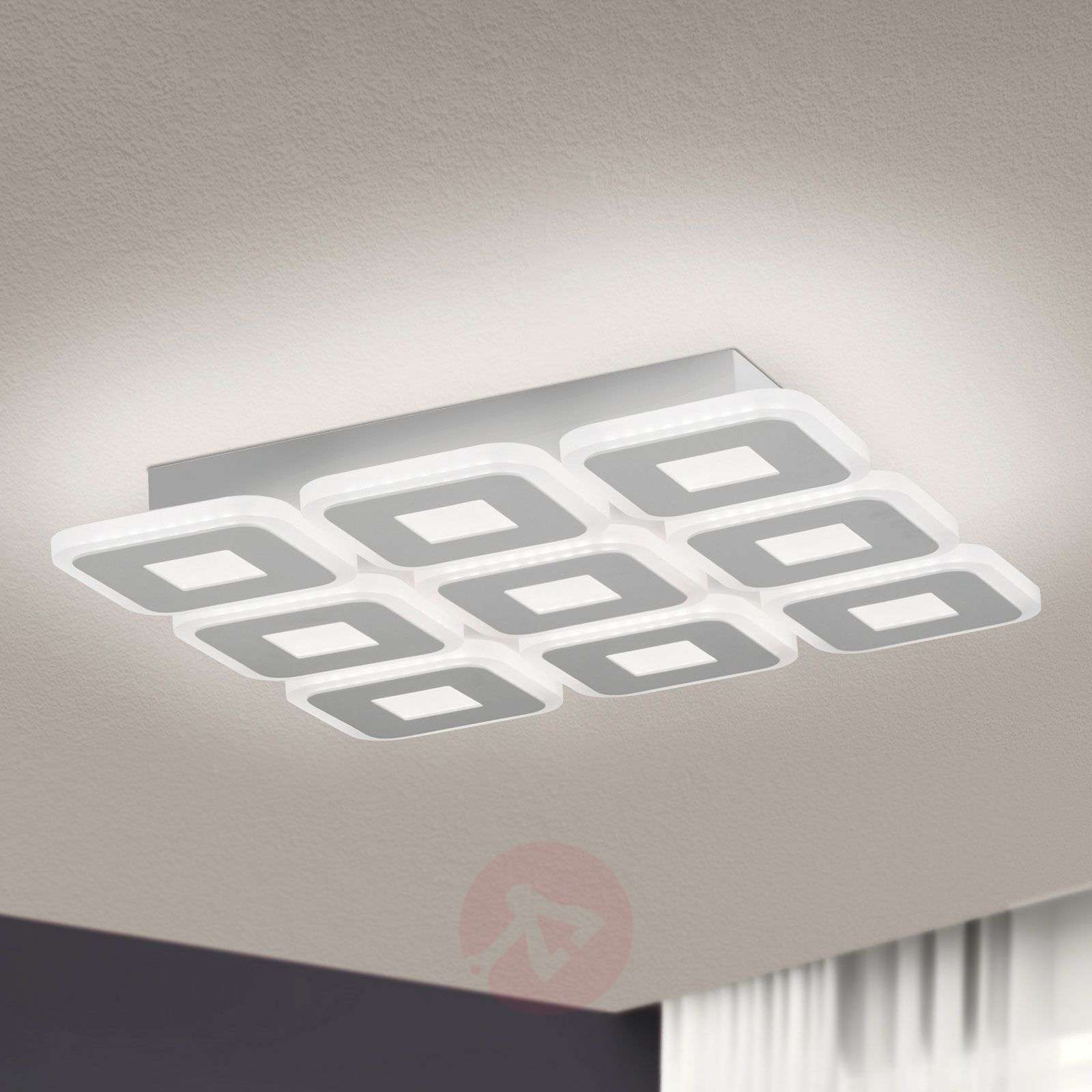Lampa sufitowa LED Domino o dyskretnym wzornictwie Ta nowoczesna lampa sufitowa LED Domino ma płaski kształt i nie przyciąga wzroku ze względu na swój dyskretny wygląd. Dzięki temu lampa ta doskonale współgra z wieloma stylami wyposażenia wnętrz. Dziewięć kwadratowych paneli tworzących tę lampę sufitową przypomina obserwatorowi domino. Ponieważ diody LED zainstalowane na stałe świecą zarówno w górę, jak i w dół, nie tylko uzyskujemy piękny efekt świetlny na suficie, ale również równomierne oświetlenie pomieszczeń. Klasa efektywności energetycznej: A