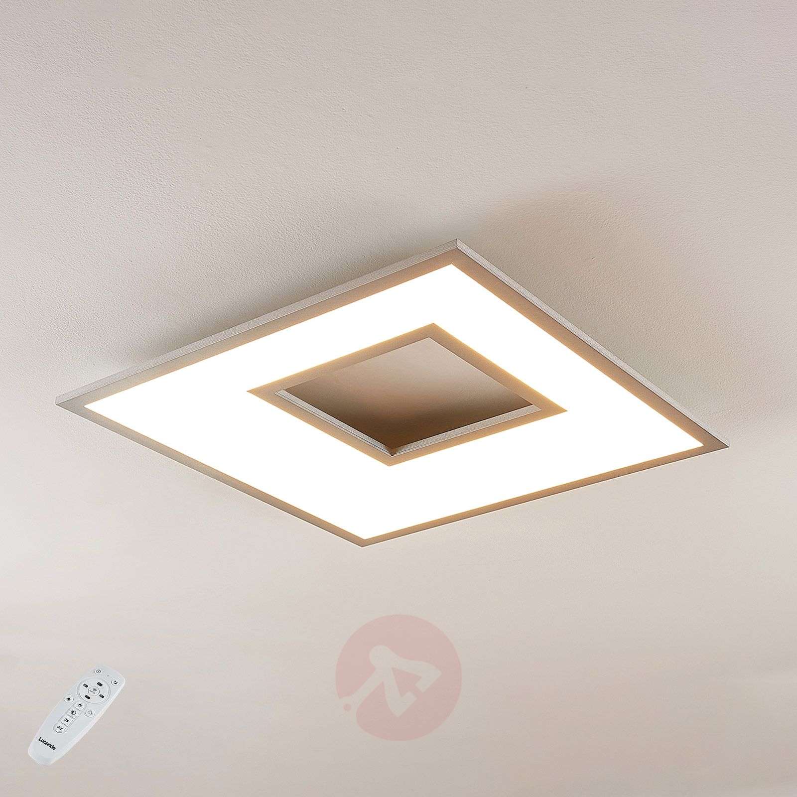 Kwadratowa lampa sufitowa LED Durun z dekoracyjnym otworem i srebrną krawędzią, możliwość regulacji jasności i barwy światła Lampa sufitowa LED Durun nadaje się do użytku prywatnego, ale sprawdzi się także w otoczeniu komercyjnym. W obu przypadkach przydatna jest możliwość regulacji zarówno jasności, jak i barwy światła. Temperaturę światła można zmieniać za pomocą zwykłego przełącznika ściennego, natomiast do regulacji jasności służy dołączony pilot. Regulacja odbywa się w 15 małych krokach lub bezstopniowo w zakresie od 10 do 100 procent. Dzięki funkcji pamięci oba parametry są zachowywane aż do następnego włączania zasilania, dzięki czemu nie ma konieczności za każdym razem dokonywania preferowanych ustawień. Oprócz tych bardzo przydatnych funkcji, lampa sufitowa LED posiada dwie dodatkowe funkcje: tryb oświetlenia nocnego i funkcję 15-minutowego timera. Wynikiem tego jest wysoki poziom funkcjonalności, który sprawdza się w wielu sytuacjach i zaspokaja wiele potrzeb. Klasa efektywności energetycznej: A+