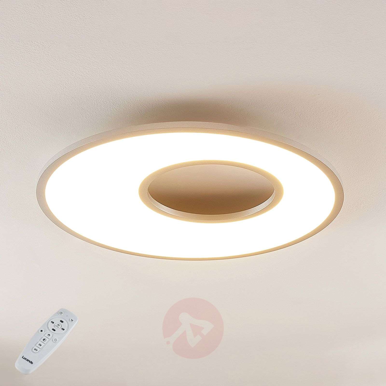 Okrągła lampa sufitowa LED Durun z otworem w kształcie pierścienia, funkcją zmiany koloru i pilotem Lampa sufitowa LED Durun jest w stanie wytwarzać wysoki stopień jasności i może być sterowana za pomocą załączonego pilota. Zewnętrzny przełącznik ścienny umożliwia regulację barwy światła w trzech krokach, tak aby uzyskać zarówno ciepłe światło białe, jak i chłodniejsze w temperaturze uniwersalnej bieli lub światła dziennego. Pilot służy do regulacji jasności w sposób ciągły w zakresie 10-100% lub w 15 małych krokach. Oprawa posiada funkcję pamięci zarówno dla barwy światła, jak i jasności, tak aby wybrane ustawienia nie zostały utracone po ponownym włączeniu oprawy. Dodatkowo, lampa sufitowa LED Durun może pracować również w trybie oświetlenia nocnego lub z funkcją 15-minutowego timera. Klasa efektywności energetycznej: A+