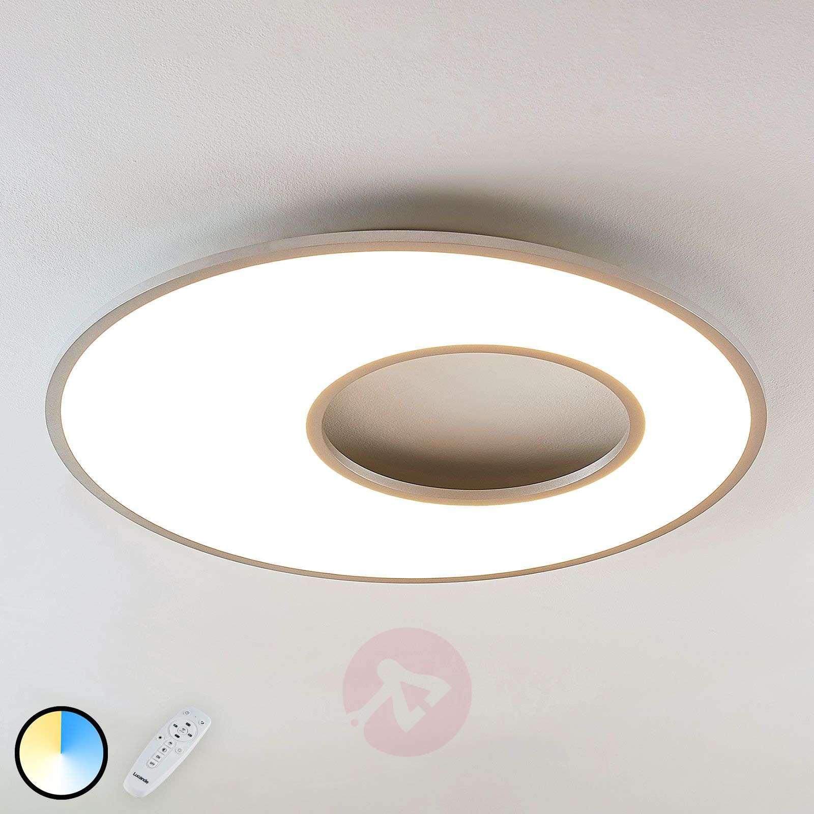 Okrągła lampa sufitowa LED Durun o dużej mocy, jasności i temperaturze światła Lampa sufitowa LED Durun posiada okrągły otwór umieszczony prawie pośrodku, a krawędź klosza utrzymana jest w atrakcyjnym srebrnym odcieniu. Jednak oprawa przekonuje nie tylko pod względem wizualnym, ale także pod względem wysokiej funkcjonalności. Przełącznik ścienny służy do regulacji barwy światła w trzech stopniach, a zawarty w zestawie pilot zdalnego sterowania służy do precyzyjnej regulacji jasności. Można to zrobić w 15 małych krokach lub bezstopniowo w zakresie od 100 do 10 procent. Obie funkcje są wyposażone w opcję pamięci, dzięki czemu wcześniej ustawione wartości są przywoływane przy następnym włączeniu urządzenia. Dwie dodatkowe przydatne funkcje to tryb oświetlenia nocnego i 15-minutowego timera, który zapewnia automatyczne wyłączenie światła po tym czasie. Klasa efektywności energetycznej: A+