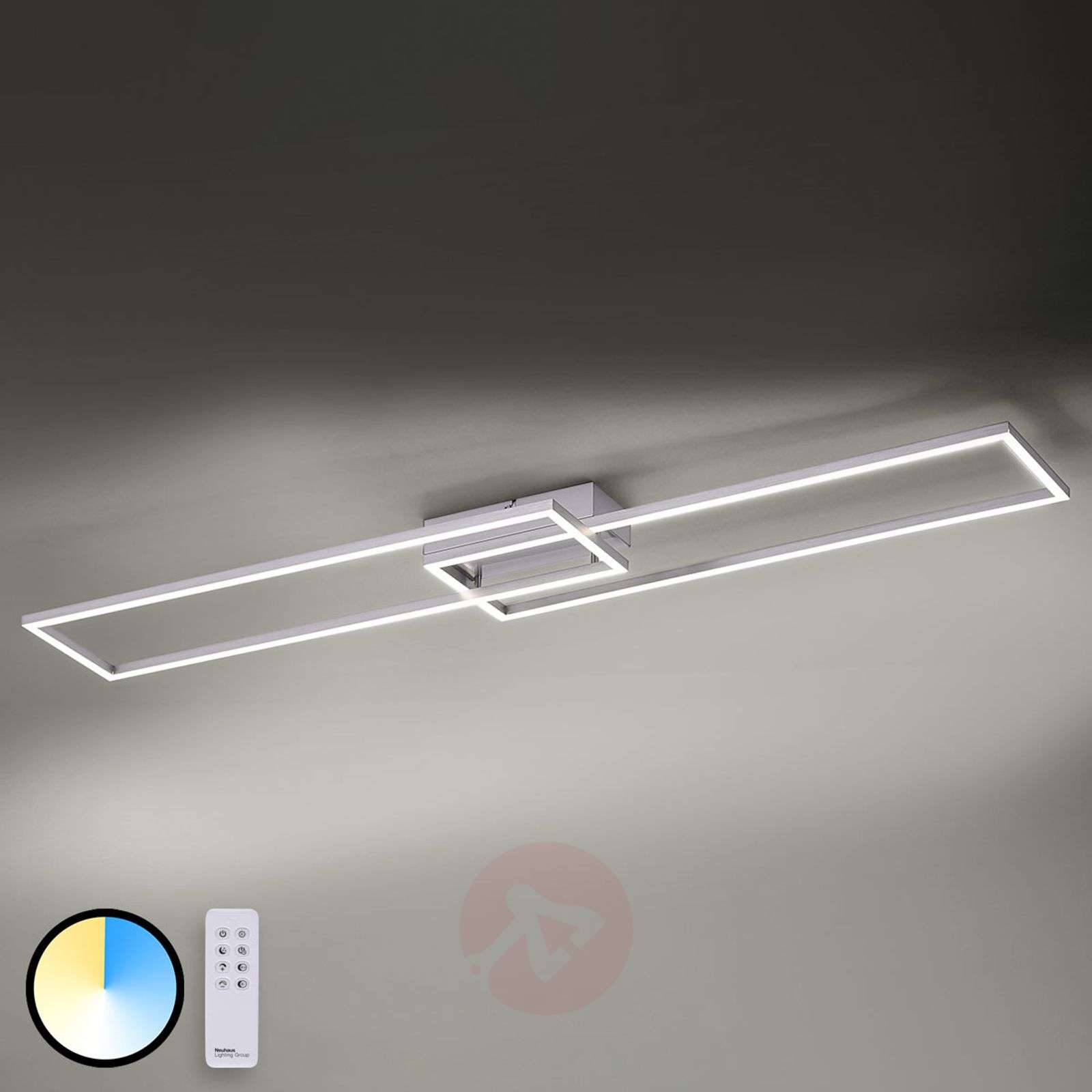 Nowoczesna lampa sufitowa LED Iven ze stali Futurystyczna i elegancka: lampa sufitowa LED Iven z pilotem wyróżnia się prostym, nowoczesnym designem i różnymi możliwościami realizacji indywidualnej koncepcji oświetlenia oferowanymi przez technologię CCT. Światło ma ogromny wpływ na nastrój i samopoczucie. Najwyższy czas zacząć o każdej porze dnia wykorzystywać w domu takie światło, jakie nam najbardziej odpowiada. Lampa sufitowa Iven jest zamocowana na suficie do prostopadłościennego cokołu i składa się z dwóch długich, nachodzących na siebie prostokątów, które biegną równolegle w dwie strony, zapewniając oświetlenie dużej powierzchni. Zarządzanie światłem CCT (Correlated Color Temperature) umożliwia również indywidualne dopasowanie koncepcji oświetleniowej. Za pomocą pilota można ustawić zarówno temperaturę światła w zakresie od ciepłej bieli do światła dziennego, jak i jego jasność. Klasa efektywności energetycznej: A+