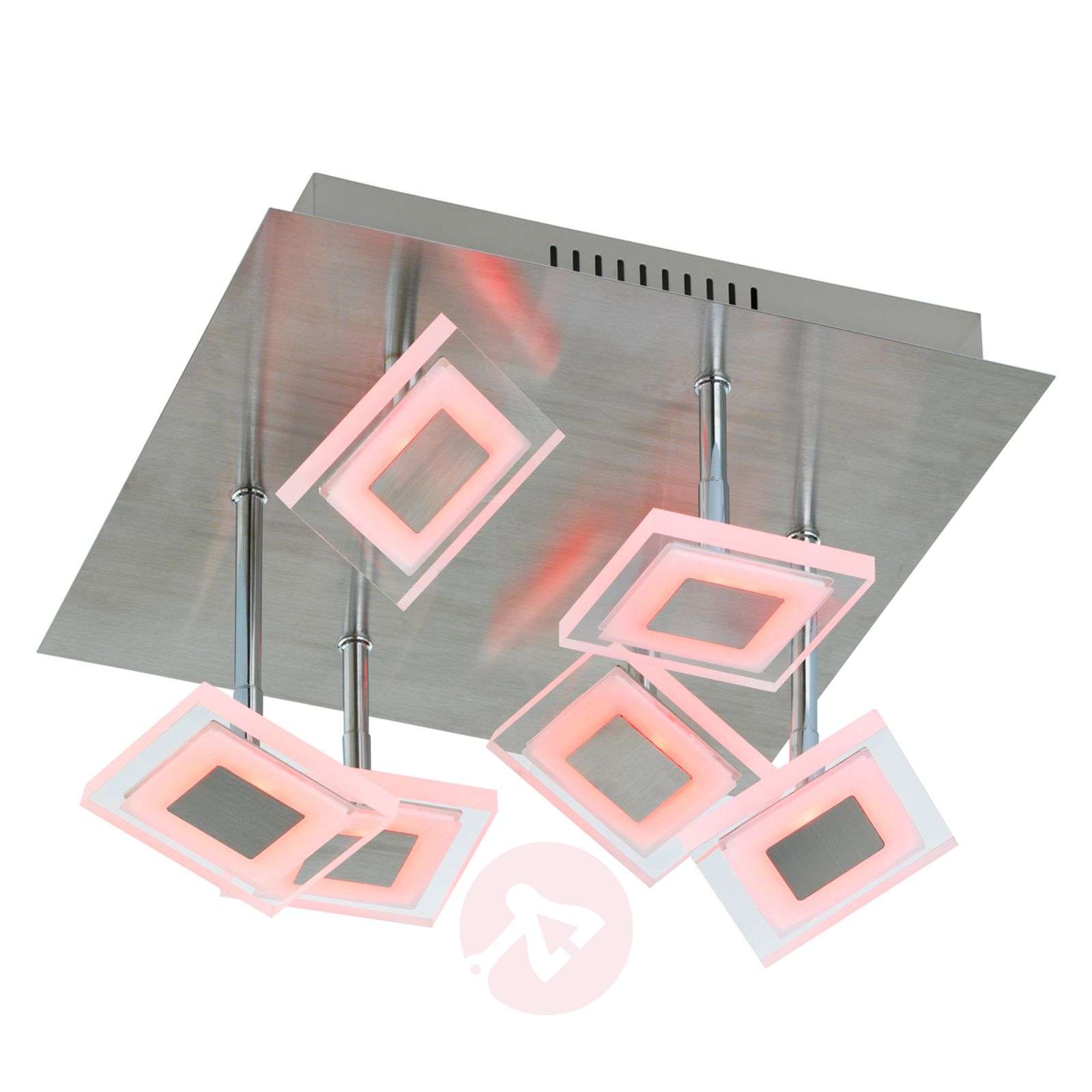 Lampa sufitowa LED Megan emitująca światło o barwie ciepłej bieli lub światło kolorowe, z praktycznym pilotem. Dostępny w zestawie pilot pozwala wybrać najróżniejsze wersje kolorystyczne oświetlenia, ponieważ ta lampa sufitowa LED wyposażona jest w żarówki emitujące nie tylko ciepło-białe światło, ale także kolorowe żarówki LED RGB. Umożliwia to nadanie pomieszczeniu zróżnicowanej atmosfery i kolorystyki oświetlenia w zależności od nastroju. Lampa sufitowa zachwyca nie tylko funkcją skokowej zmiany barw RGB, ale także nowoczesną stylistyką. Wynika ona z połączenia chromowanego, kwadratowego stelaża sufitowego oraz akrylowych elementów zamocowanych na nim za pomocą elementów dystansujących. Ściemnianie wyłącznie za pomocą dostarczonego pilota. Klasa efektywności energetycznej: A