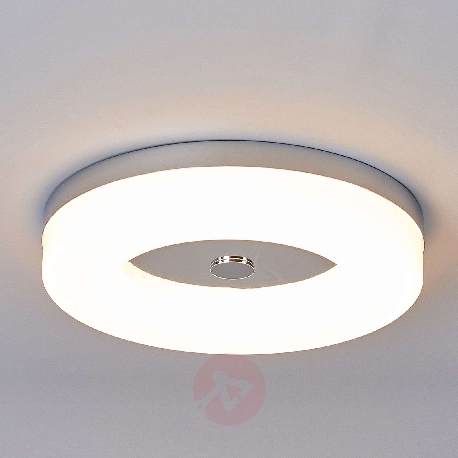 Lampa sufitowa LED SHANIA w postaci pierścienia - idealna do stosowania w łazience Stopień ochrony IP44 umożliwia bezproblemowe stosowanie lampy sufitowej SHANIA, która jest wyposażona w ciepłobiałą żarówkę LED, w łazienkach. Posiada wystarczające zabezpieczenie przed wnikaniem odprysków wody. Lampa odznacza si ponadto ponadczasowym, prostym designem, dlatego pasować będzie do różnych stylów łazienek. Na zewnątrz znajduje się dyfuzor z tworzywa sztucznego w kształcie pierścienia, w środku zaś i przy samym suficie znajduje się okrągła oprawa wykończona błyszczącym chromem. Klasa efektywności energetycznej: A+