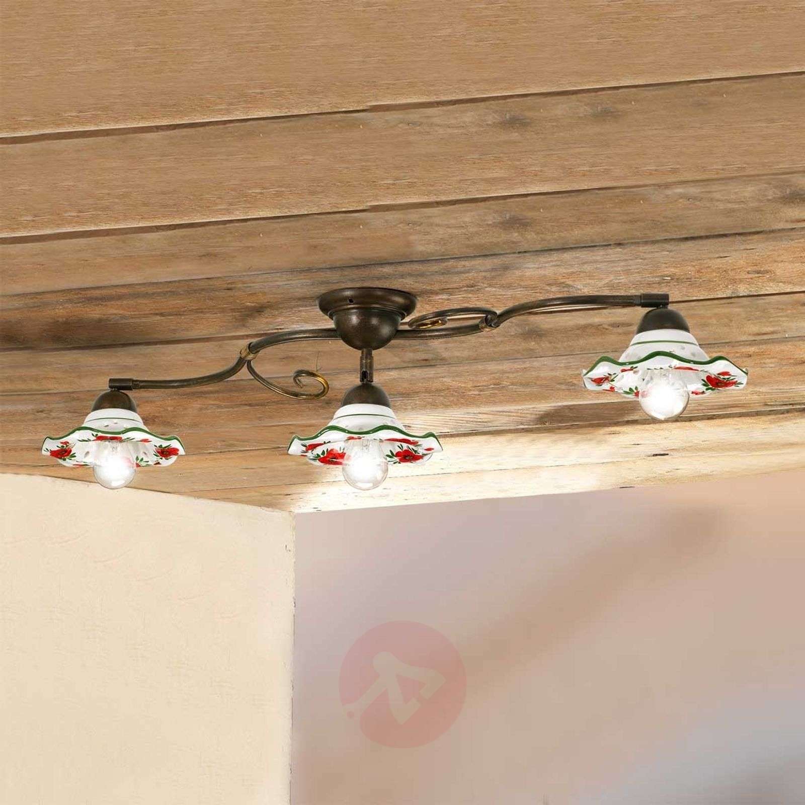 Lampa sufitowa ROSOLACCI z ceramicznymi kloszami Delikatnie zdobiona lampa sufitowa ROSOLACCI zachwyca ceramicznymi kloszami, umieszczonymi na giętym ramieniu, rozciągającym się na suficie. Lampa wyposażona jest w trzy, pięknie uformowane klosze z falującymi krawędziami, oddające jasne światło bezpośrednio w dół. Motyw kwiatowy naniesiony na białą ceramikę wypełnia otoczenie nutą ciepła i naturalności, a swój urok szczególnie pięknie lampa odkrywa w pomieszczeniach w stylu dworkowym. Klasa efektywności energetycznej: A++