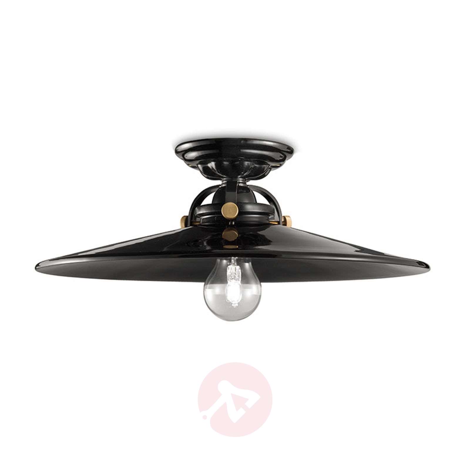 Lampa sufitowa retro C105, włoski design Ta lampa sufitowa C105 dzięki wyrazistym kolorom i błyszczącej powierzchni stanowi element bardzo współczesny, przy czym wspomnienie stylu często występującego w przeszłości pozostaje wciąż żywe. Zarówno klosz, jak i rozeta sufitowa są wykonane z ceramiki. Dzięki błyszczącemu wykończeniu, z racji braku zbędnych ozdób i oraz dzięki obecności złoconych śrub mocujących ta lampa sufitowa może być stosowana w pomieszczeniach urządzonych w najrozmaitszych stylach. Ta lampa sufitowa wygląda szczególnie stylowo, gdy jest wyposażona w żarówkę filamentową w stylu retro lub taką posiadającą element podobny do włókna węglowego. Wyprodukowano we Włoszech. Klasa efektywności energetycznej: A++