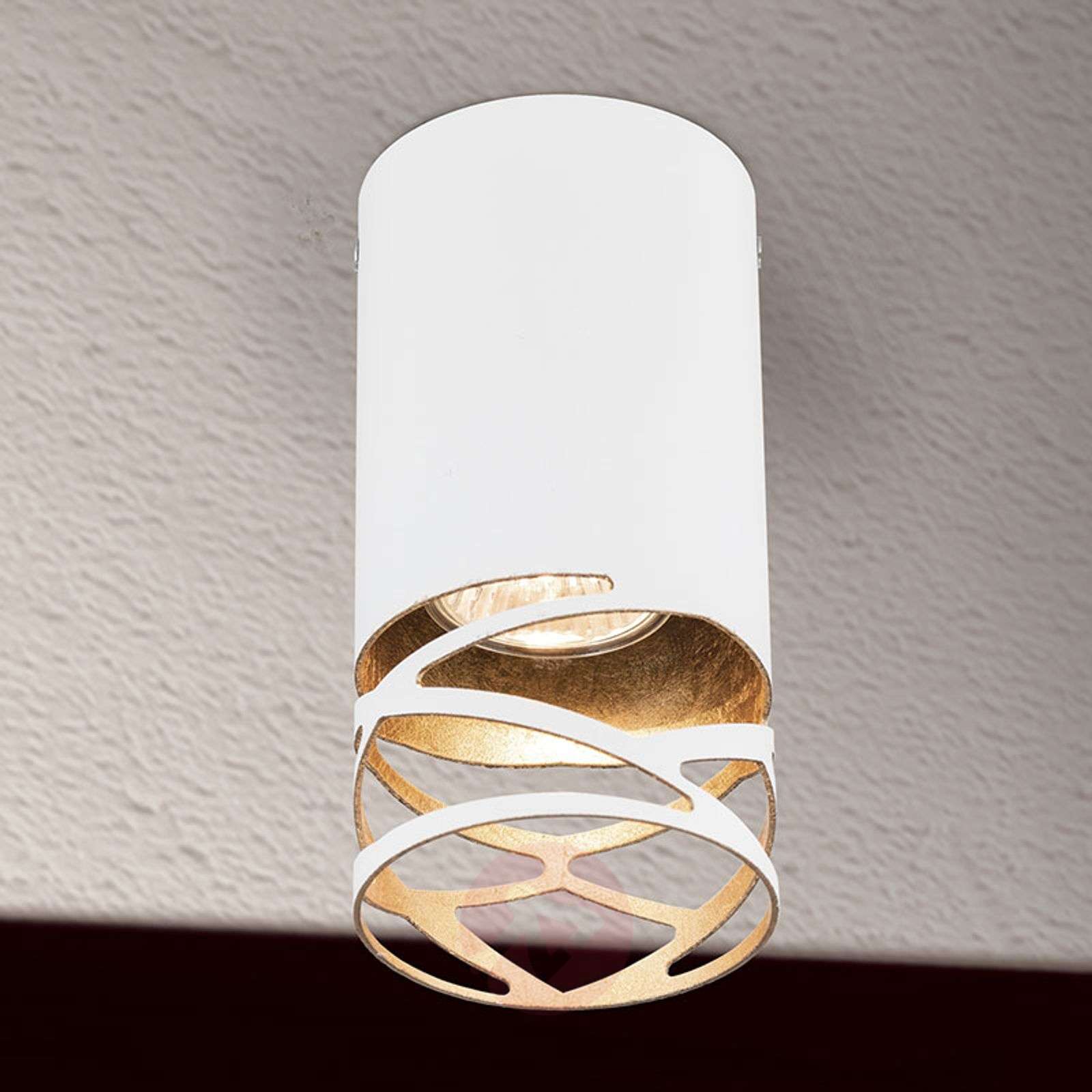 Ręcznie wykonana lampa sufitowa Trance pokryta złotem płatkowym Lampa wisząca Trance, z kloszem o bardzo ekskluzywnym wyglądzie, została wykonana ręcznie we Włoszech: z klosza, który został pomalowany z zewnątrz na biało, wycięto dekoracyjny wzór przy użyciu technologii cięcia laserowego, wewnątrz klosz wyposażony jest w aplikacje ze złota płatkowego, które wyraziście podkreślają wzór. Powłoka ze złota płatkowego tworzy bardzo specyficzną atmosferę oświetleniową, gdy tylko włączy się światło. Świetna lampa sufitowa, która może być umieszczona pojedynczo lub w grupach, do nastrojowego oświetlenia pomieszczeń. Klasa efektywności energetycznej: A++