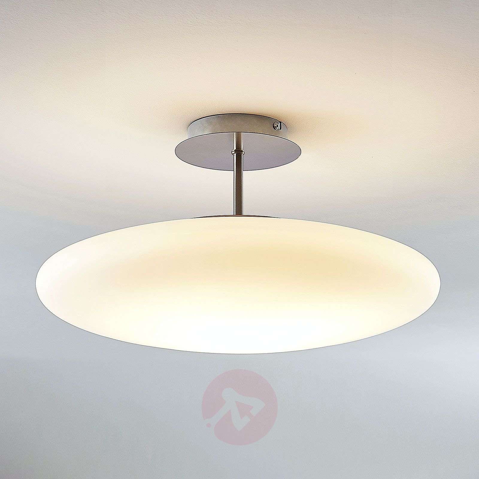 Biała, lampa sufitowa ze szkła opalowego LED Gunda w okrągłym kształcie z możliwością przyciemnienia Biały, szklany klosz lampy sufitowej LED Gunda jest bardzo płaski i przekonuje harmonijnym, pięknym kształtem. Światło LED lampy sufitowej o barwie ciepłej bieli może być emitowane równomiernie na wszystkie strony i w ten sposób łagodnie i przyjemnie oświetlać pomieszczenie. Lampa sufitowa pasuje równie dobrze do wszystkich salonów, sypialni i korytarzy. Wbudowane diody LED pracują w technologii wysokonapięciowej, zużywają niewiele energii elektrycznej i są energooszczędne. Za pomocą przełącznika na ścianie można wygodnie i szybko regulować jasność na trzech poziomach bez konieczności instalowania dodatkowych akcesoriów. Bardzo piękna lampa do nowoczesnych wnętrz, która ze względu na ponadczasowy wygląd może być również zawieszana w bardziej klasycznych pomieszczeniach. Klasa efektywności energetycznej: A+