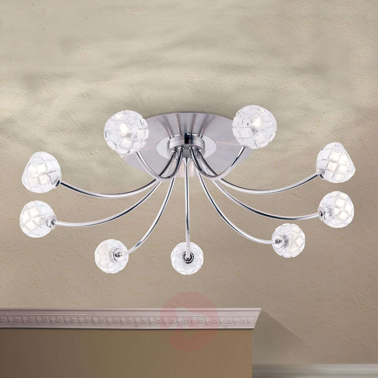 Lampa sufitowa Maderno ze szlifowanymi kryształami ze szkła ołowiowego W wyglądzie lampy sufitowej Maderno, która wypełnia pomieszczenie pięknym połyskiem, dominują okrągłe i wygięte kształty. Na lekko wygiętych na zewnątrz mosiężnych ramionach lampy zamocowane są okrągłe klosze ze szkła ołowiowego, ozdobione romboidalnym wzorem, powstałym w wyniku szlifu diamentowego. Dzięki specjalnemu sposobowi szlifowania same romby o satynowanej powierzchni stanowią przeciwieństwo dla transparentnych szlifowanych szczelin, co sprawia, że klosze wyglądają szczególnie interesująco w połączeniu z padającym światłem. Wybrana kolorystyka sprawia, że Maderno jest szczególnie ponadczasową lampą, ponieważ dzięki częściowo matowemu i częściowo błyszczącemu niklowemu wykończeniu mosiężnych elementów oraz białym kloszom ta lampa sufitowa z łatwością komponuje się z istniejącym stylem aranżacji wnętrz. Szczególnie imponująca jest lampa produkowana w austriackim zakładzie produkcyjnym. Wygląda ona tak dzięki zastosowaniu wysokiej jakości materiałów i starannemu wykonaniu. Klasa efektywności energetycznej: A++