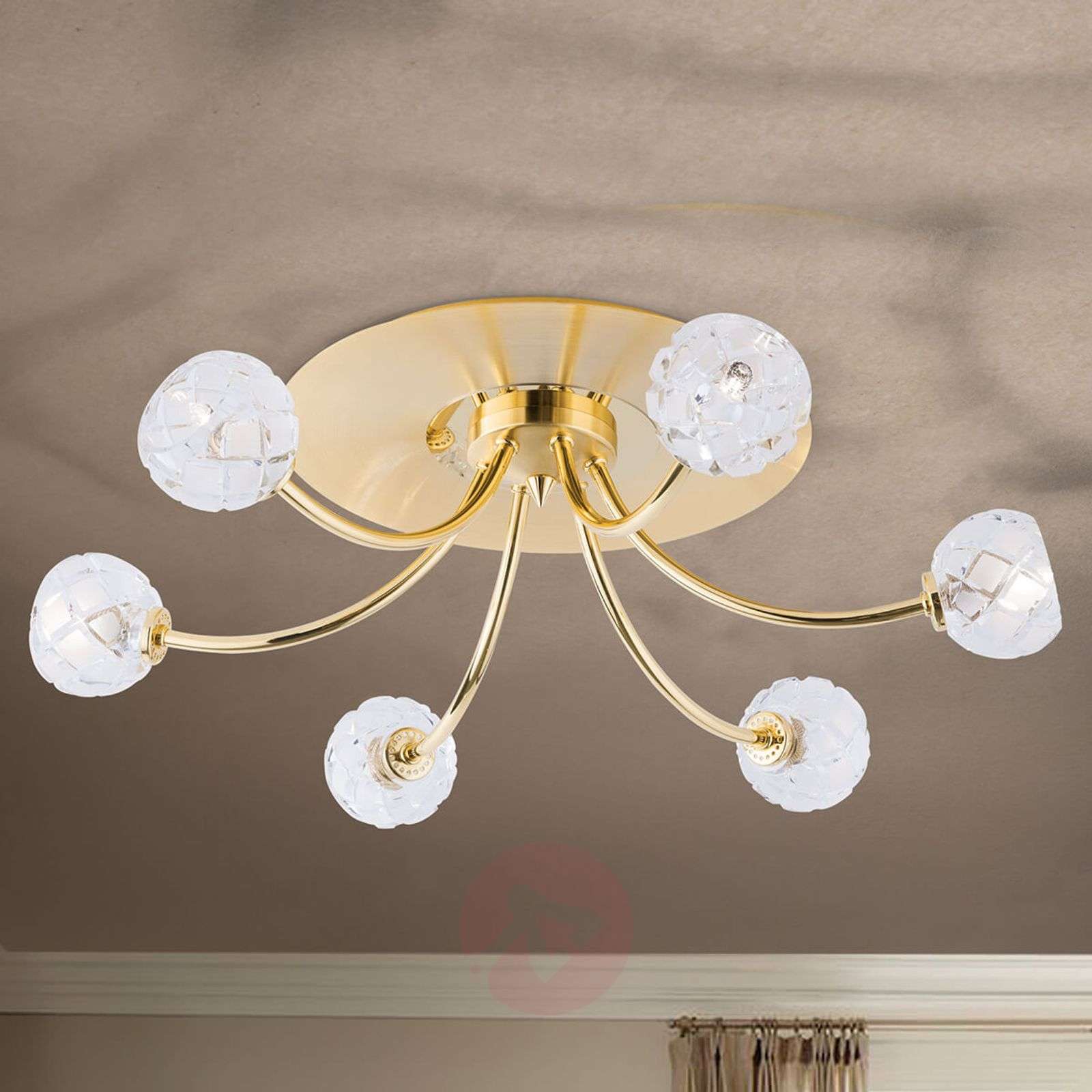 Pozłacana lampa sufitowa Maderno, 24 karaty Sześć ramion lampy sufitowej Maderno odstaje w kierunku do pomieszczenia i zapewnia stylowe oświetlenie ogólne, na przykład nad stołem jadalnym lub w salonie. Maderno to najwyższej klasy element oświetleniowy, który stał się takim dzięki ręcznemu wykonaniu i specjalnemu charakterowi zastosowanych materiałów. Podstawa wykonana jest z litego mosiądzu i jest pozłacana 24-karatowym złotem, częściowo matowa, częściowo błyszcząca. Prawie okrągłe szklane klosze są wykonane z najlepszego kryształu ołowiowego i nadano im szlachetny diamentowy szlif z efektownym romboidalnym wzorem. Firma, która wytwarza tę lampę, produkuje ją ręcznie w Austrii od prawie 70 lat, a jej znakiem rozpoznawczym jest wyjątkowa jakość i w bardzo dostojny wygląd. Klasa efektywności energetycznej: A++