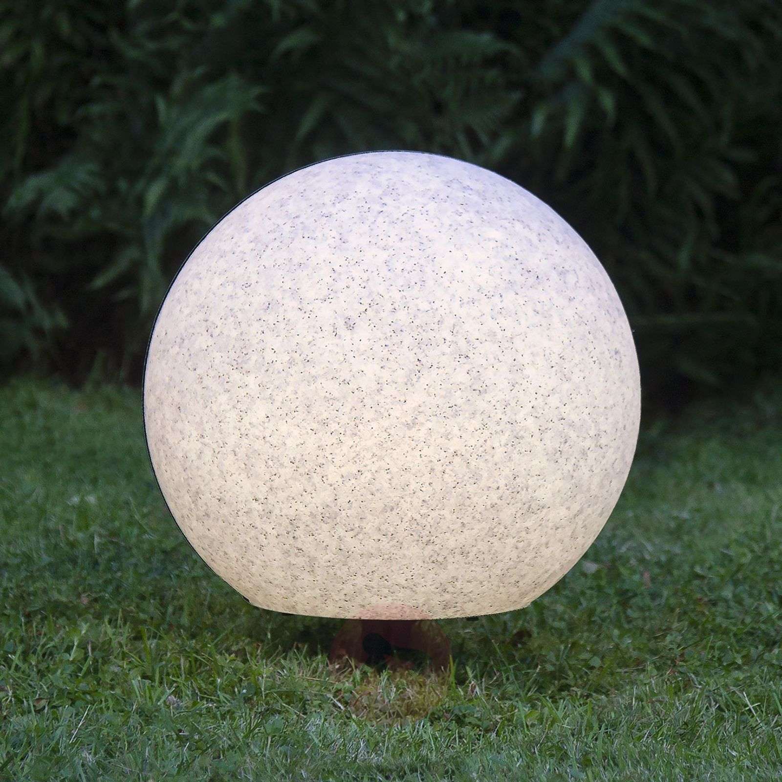 Świecąca kula do dekoracji ogrodowej w różnych rozmiarach - oświetlenie dekoracyjne Gardenlight Lampa dekoracyjna Gardenlight jest białą, kulistą lampą ogrodową, która posiada zarówno niewielką podstawę, jak i grot ziemny, który można przymocować u dołu. Klosz wykonany jest z tworzywa sztucznego, a jego powierzchnia przypomina jasny kamień. Cały klosz jest oświetlony przez punkt świetlny, do którego można włożyć odpowiednią żarówkę E27. Żarówka nie należy do zestawu i można ją zakupić w dziale „Akcesoria dodatkowe”. Dzięki długiemu przewodowi zasilającemu lampę można stosować w ogrodzie również w pewnej odległości od domu. Klasa efektywności energetycznej: A++