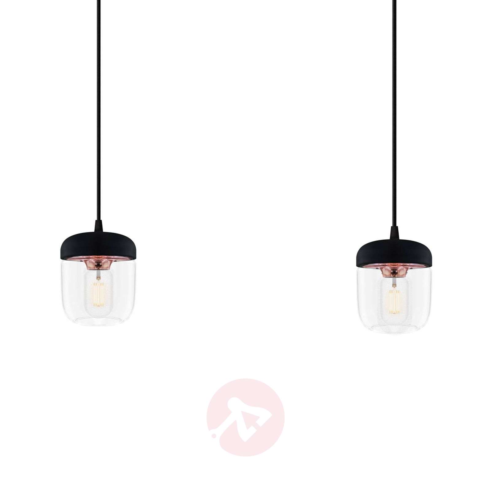 Lampa wisząca Acorn, 2-punktowa, stanowiąca efektowne połączenie różnych elementów Lampa wisząca Acorn nadaje się doskonale do zapewniania wszystkich rodzajów oświetlenia. Daje nastrojowe oświetlenie ogólne lub powierzchniowe, a nawet dopuszcza możliwość wprowadzania zmian, jako że klosze mogą być ustawiane na tej samej wysokości lub zamocowane na różnych wysokościach. Wymaga to połączenia dwóch kloszy Acorn autorstwa Jacoba Rudbecka z 2-punktowym zawieszeniem Cannonball Cluster, zaprojektowanym przez Sørena Ravna Christensena, designera i współzałożyciela UMAGE. Lampie nadano nazwę uwzględniającą kształt kloszy: Przypominają one żołędzie (po angielsku acorn). Mają czworokątny zaokrąglony kształt, są zaś wykonane z przezroczystego szkła. Czapeczka jest czarna, a metalowy rdzeń ma odcień polerowanej miedzi. Ten metalowy rdzeń dzięki światłu tworzy również wspaniałą atmosferę w pomieszczeniu. Zawieszenie wyposażone jest w okrągłą pokrywę (w środku znajduje się kabel) oraz w kabel 2 x 250 cm. Jako źródło światła polecane są atrakcyjne żarówki filamentowe lub rustykalne, dostępne w dziale „Akcesoria dodatkowe”. Klasa efektywności energetycznej: A++