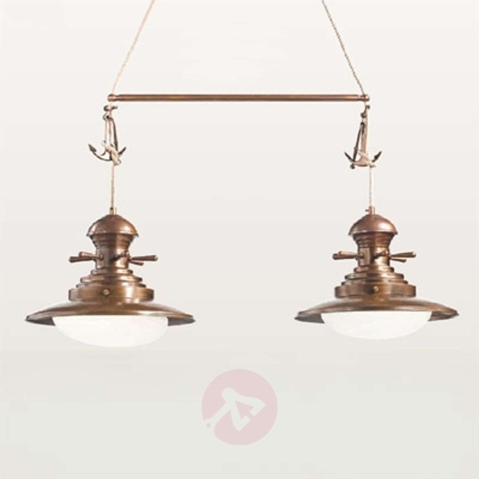 Dwupunktowa lampa wisząca Baia - efektowna i jasna Lampa wisząca Baia będzie idealnym uzupełnieniem wnętrz urządzonych w stylu marynarskim: zafascynuje swoim wyglądem nie tylko wielbicieli morskich wypraw. Pozwoli na wyczarowanie nastrojowego oświetlenia ogólnego w domu, mieszkaniu, czy urządzonej w stylu marynarskim restauracji. Dwa przypominające swoim kształtem koło sterowe klosze lampy są wykonane z brązowanego mosiądzu, zaś duże klosze z mrożonego szkła. Podwieszenie lampy zdobią morskie detale: kotwica oraz lina. Klasa efektywności energetycznej: A++