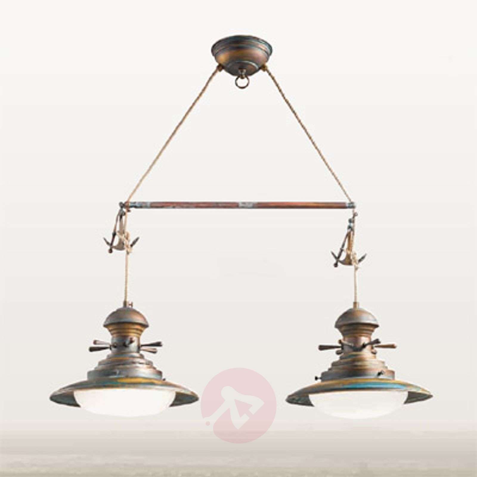 Dwupunktowa lampa wisząca Baia - efektowna i jasna Lampa wisząca Baia będzie idealnym uzupełnieniem wnętrz urządzonych w stylu marynarskim: zafascynuje swoim wyglądem nie tylko wielbicieli morskich wypraw. Pozwoli na wyczarowanie nastrojowego oświetlenia ogólnego w domu, mieszkaniu, czy urządzonej w stylu marynarskim restauracji. Dwa przypominające swoim kształtem koło sterowe klosze lampy są wykonane z brązowanego mosiądzu, zaś duże klosze z mrożonego szkła. Podwieszenie lampy zdobią morskie detale: kotwica oraz lina. Klasa efektywności energetycznej: A++