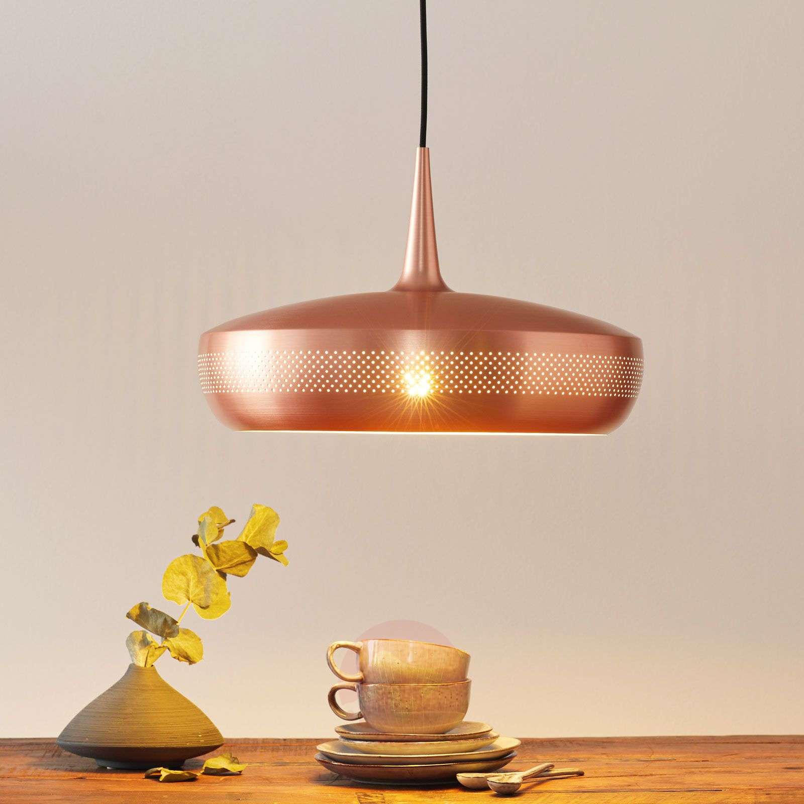Lampa wisząca Clava Dine z wzorem otworów, szczotkowana miedź, elegancja w stylu retro Dzięki miedzianemu odcieniowi klosza wykonanego z aluminium, stanowiącego część tej lampy wiszącej Clava Dine, ta piękna lampa z pewnością nie pozostanie niezauważone w pomieszczeniu, nawet po wyłączeniu oświetlenia. Przy włączonym oświetleniu doskonale podkreślony jest wzór z małych otworów, który tworzy bardzo dekoracyjną i przytulną atmosferę. Lampa wisząca Clava Dine została zaprojektowana w stylu retro przez Sørena Ravna Christensena i z pewnością nigdy nie wyjdzie z mody. Atrakcyjne źródło światła, zarówno do zapewnienia oświetlenia indywidualnego, jak i do aranżacji grupowych. Søren Ravn Christensen pracuje jako twórca dla firmy oświetleniowej UMAGE, której jest współzałożycielem i która jest synonimem wysokiej jakości produktów designerskich o designie skandynawskim. Klasa efektywności energetycznej: A++
