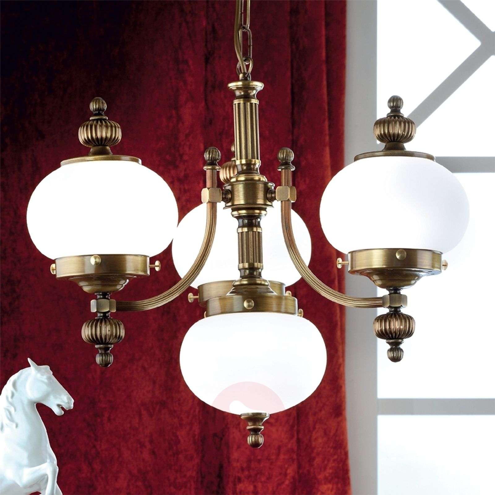 Żyrandol DELIA w wersji 4-punktowej z powierzchnią z ręcznie cieniowanego, starzonego mosiądzu Jedno jest pewne: obok tego imponującego żyrandola w stylu tradycyjnych, wiedeńskich kawiarni nie można przejść obojętnie! Pękate kule z matowego, mlecznego szkła staną się dominującym elementem w stylistyce wnętrza, zapewniając przy tym iście królewskie oświetlenie - jasne, lecz nie oślepiające, gdyż białe klosze emitują piękne, nastrojowe światło. Lampy te spełniają najwyższe wymagania w zakresie wysokiej jakości, elegancji i trwałości. Tutaj połączenie kreatywności projektantów i austriackiej sztuki rzemieślniczej pozwala na stworzenie produktów, znajdujących uznanie na arenie międzynarodowej. Od roku 1948 lampy tego producenta są wytwarzane w 100 % w Austrii, co gwarantuje dostępność części zamiennych przez długie lata. Na zapytanie dostępna także w innych rozmiarach i wykończeniach powierzchni. Klasa efektywności energetycznej: A++