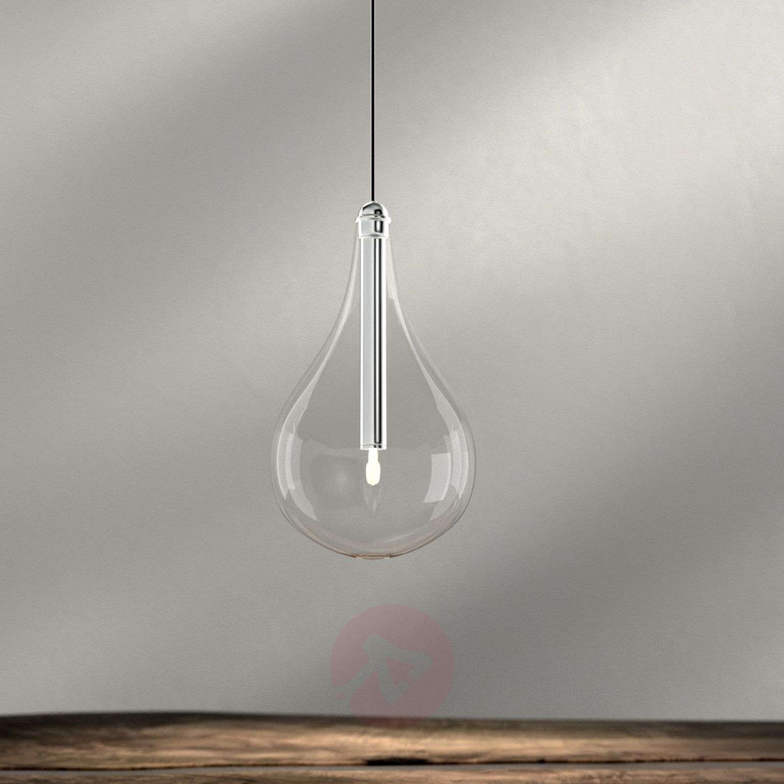 Na cześć przezroczystej szklanej żarówki: lampa wisząca Drop W przypadku tej designerskiej lampy wiszącej, zawarte w niej źródło światła jest z jednej strony połączone z unikalną formą, ale z drugiej strony wcale nie jest czymś nieznanym: Bez względu na to, jak się go obróci, przezroczysta żarówka wykonana ze szkła borokrzemowego przypomina klasyczną żarówkę. Oczywiście sposób działania żarówki niskonapięciowej jest inny, ale poznaliśmy żarówkę jako źródło światła, którą dobrze pamiętamy. Dlatego konstrukcja tego produktu sama w sobie, tzn. nawet bez włączania oświetlenia, budzi entuzjazm. Transformator elektroniczny jest już dołączony do zestawu. Klasa efektywności energetycznej: C