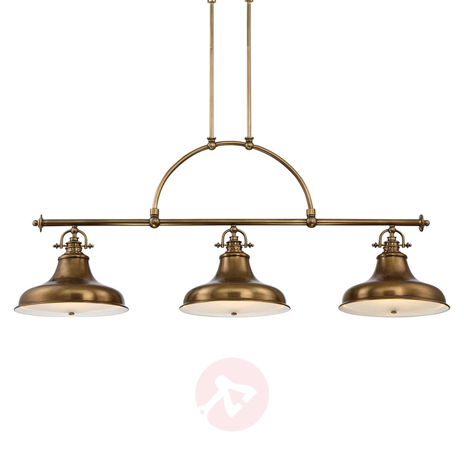 3-punktowa lampa wisząca Emery – oświetlenie stołu w stylu industrialnym Wizualnie, widok 3-punktowej lampy wiszącej Emery, z mosiężnym wykończeniem w kolorze antycznym, przywołuje skojarzenia z klasycznym amerykańskim stylem epoki przemysłowej. Atmosferę w stylu przemysłowym można optymalnie dopełnić lampą wiszącą Emery. Na przykład, Emery odpowiednio oświetla podłużny stół w jadalni lub zapewnia idealne warunki oświetleniowe nad ladą kuchenną. Jako źródło światła można stosować wszystkie rodzaje żarówek, w tym energooszczędne żarówki LED z odpowiednim cokołem E27 (można zamówić w dziale „Akcesoria dodatkowe”). Klasa efektywności energetycznej: A++