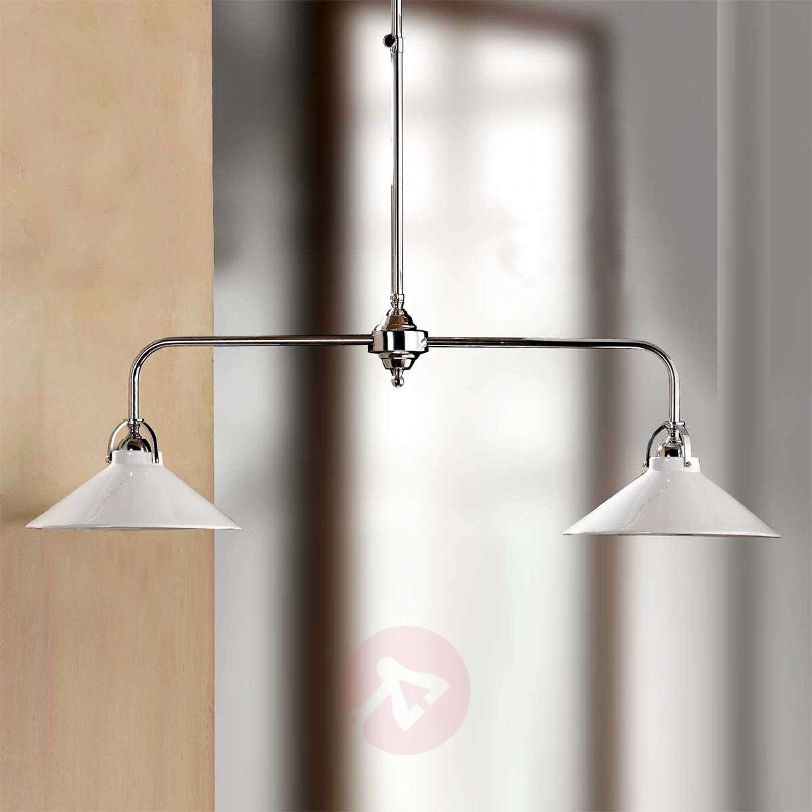 Nowoczesna lampa wisząca GIACOMO z ceramicznymi kloszami Ta praktyczna lampa wisząca wkomponuje się w każdy styl wnętrz. Ma dwa, błyszczące bielą ceramiczne klosze umieszczone na chromowanym ramieniu. Lampę GIACIOMO można regulować, dostosowując wysokość padania światła do indywidualnych potrzeb. Klosze mają 26 cm średnicy, pięknie odbijają światło i kierują je bezpośrednio w dół. Klasa efektywności energetycznej: A++
