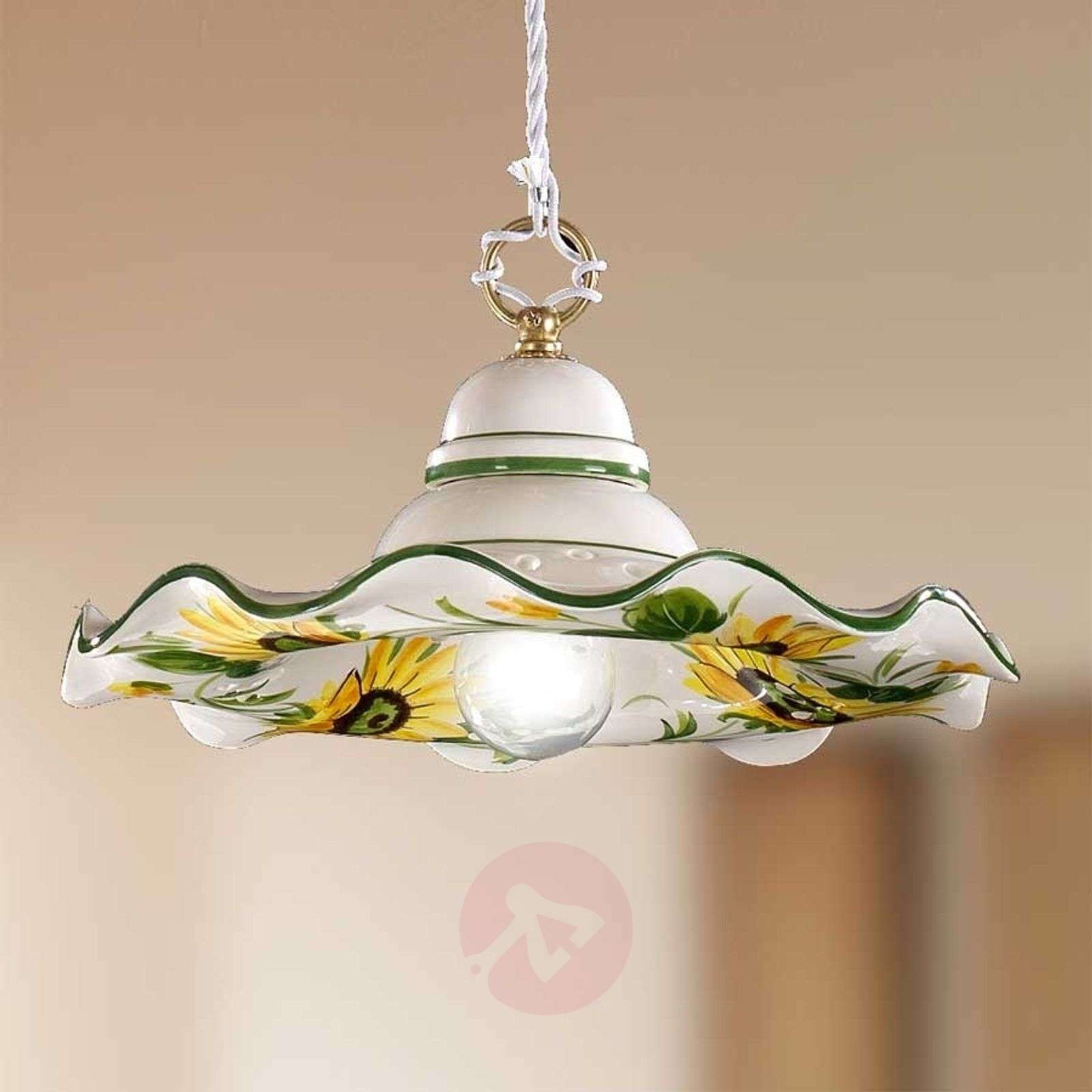 Lampa wisząca GIRASOLA w stylu dworkowym GIRASOLA jest lampą wiszącą w stylu dworkowym, która pięknie ozdobi i rozświetli kuchnie i jadalnie. Ma biały, ceramiczny klosz z falowaną krawędzią, kierujący strumień światła bezpośrednio w dół. Niewielkie otworki i motyw kwiatowy ze słonecznikiem na białym kloszu, dodają lampie naturalnego uroku. Ujmującym detalem jest kolorowy brzeg klosza. Klasa efektywności energetycznej: A++